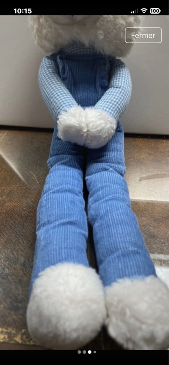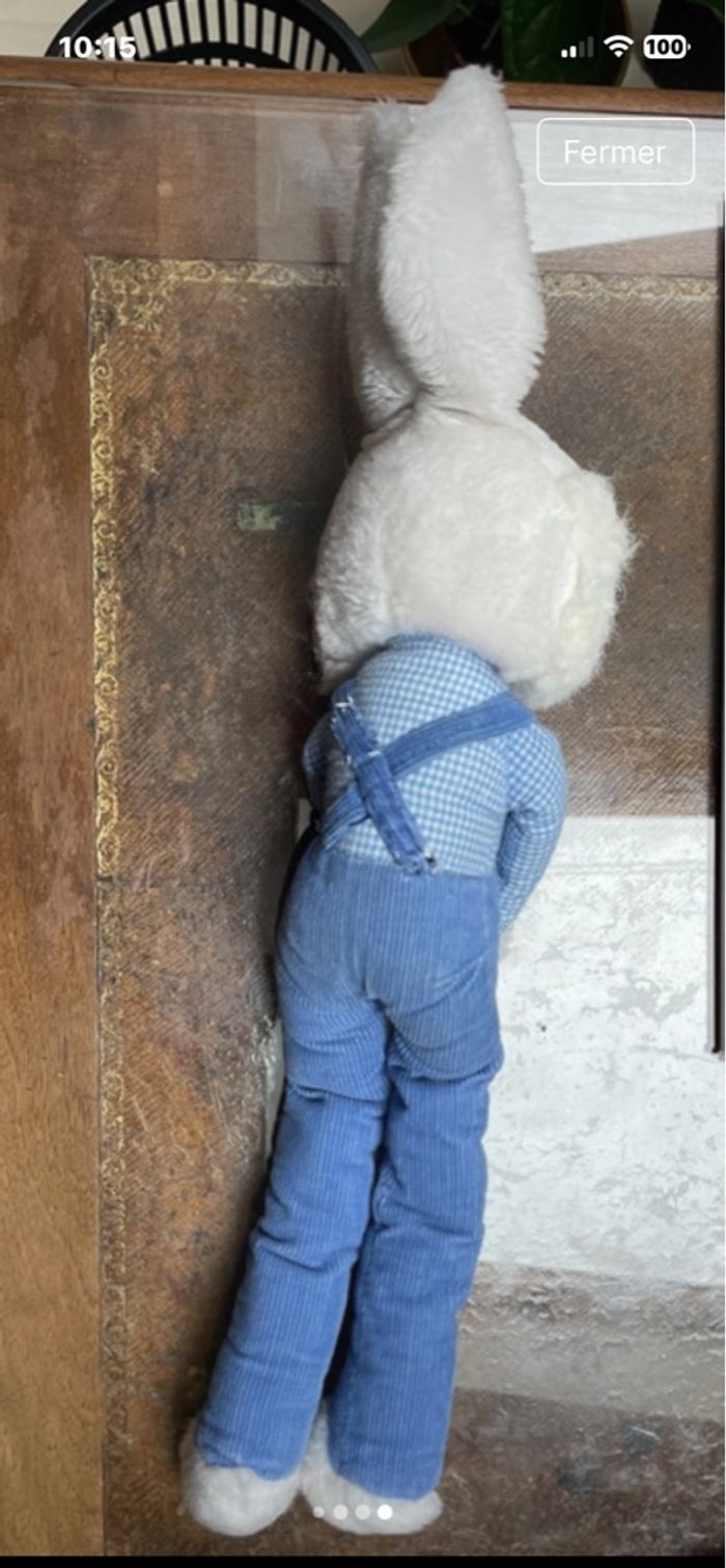Peluche, monsieur lapin en bleu de travail, longueur 43 cm, largeur tête 11 cm, largeur corps 9 cm
