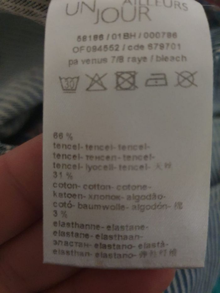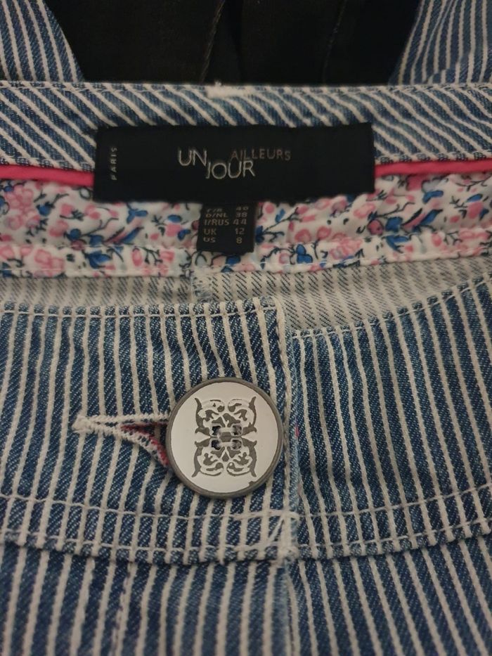 🌿 Ajoutez une touche de fraîcheur et d'élégance à votre garde-robe avec ce pantalon 7/8ème de la célèbre marque Un Jour Ailleurs. Sa coupe droite légèrement ajustée et son motif à fines rayures verticales (style tennis/seersucker) allongent la silhouette pour un look à la fois chic et décontracté. 🌿Confort & Matière Éco-responsable🌿 Ce modèle se distingue par sa composition premium : 66% Tencel (Lyocell) : Une fibre naturelle, soyeuse et respirante, offrant un tombé impeccable. 31% Coton : Pour la douceur et la résistance au quotidien. 3% Élasthanne : Pour un effet stretch qui garantit une liberté de mouvement totale. 💖 Pourquoi on l'adore 💖  💜 Coupe : Pantalon cigarette longueur 7/8ème avec un léger délavage "bleach" pour un aspect moderne. 🩷 Finitons : Bouton argenté travaillé avec logo gravé, poches avant et poches arrière plaquées avec surpiqûres graphiques. 🩵 Intérieur : Doublure de ceinture fleurie pour une finition haut de gamme typique de la maison Un Jour Ailleurs Paris. 🧡 Effet délavé pour un look moderne qui allonge la silhouette.  💡 Complétez votre silhouette avec la chemise Pétunia de la même collection. On adore le souci du détail : un rappel subtil des motifs floraux et des fines rayures qui lie parfaitement ces deux pièces iconiques Un Jour Ailleurs. 🏷 Marque : Un Jour Ailleurs  🔸️ Coupe 7/8ème  📐 Taille 40 🧶 66% Tencel, 31% Coton,  3% Elasthanne.  🏠 Prix boutique : 150€ 📏 Pour vous assurez qu'il vous ira parfaitement fiez-vous à la grande sagesse de Maître Ruban ⤵️  Taille 40cm Longeur 92cm Entrejambe 67cm  🌟 Très bon état 🌟  📦 Envoi rapide et soigné