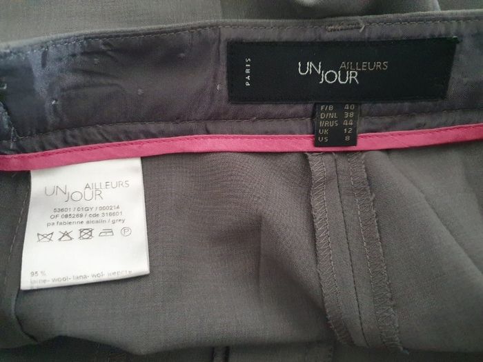 👉 Alliez élégance absolue et confort moderne avec ce pantalon habillé Un Jour Ailleurs. Sa coupe droite structurée et sa teinte grise intemporelle en font une pièce maîtresse pour un look business chic ou une cérémonie estivale. 🌺 Le modèle Fabienne est l'un des classiques de la maison Un Jour Ailleurs. Il est particulièrement apprécié pour sa coupe droite équilibrée qui convient à toutes les morphologies. Son secret ? Une structure qui emboîte parfaitement les hanches sans serrer, offrant une silhouette longiligne et professionnelle. 🌿 Ne vous laissez pas tromper par sa composition en laine : il s'agit d'une laine froide ultra-légère (95%) mélangée à de l'élasthanne (5%), offrant un tissu fluide, respirant et naturellement infroissable.  Pourquoi on l'adore 💖  🩵 Confort Adaptatif : La ceinture est équipée de discrets empiècements élastiqués sur les côtés, permettant au pantalon de s'ajuster parfaitement à votre morphologie tout au long de la journée. 🧡 Polyvalence : Présence de passants de ceinture pour accessoiriser votre tenue et structurer votre silhouette. 💜 Finition Luxe : Entièrement doublé en polyester (100%) pour un glissé parfait sur la jambe et un confort soyeux. 🩷 Pratique : Poches latérales discrètes et boutonnage soigné. 🏷 Marque : Un Jour Ailleurs (UJA Paris). 📐 Taille 40 🧶 Matières : 95% Laine, 5% Élasthanne | Doublure 100% Polyester. 🌈 Coloris : Gris moyen / Gris anthracite clair. 🇧🇬 Origine : Fabriqué en Bulgarie. 🏠 Prix boutique : 150€ 📏 Pour vous assurez qu'il vous ira parfaitement fiez-vous à la grande sagesse de Maître Ruban ⤵️  Taille : 39cm Longeur 109cm Entrejambe 81cm 🌟 Très bon état 🌟  📦 Envoi rapide et soigné