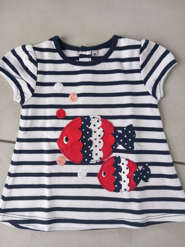 Tenue d'été fille composée de : - 1 legging bleu marine avec froufrous rouge - 1 T-shirt marinière avec dessins de poissons. Boutons dans le dos. Taille : 6 mois Marque : sans marque État : très bon état