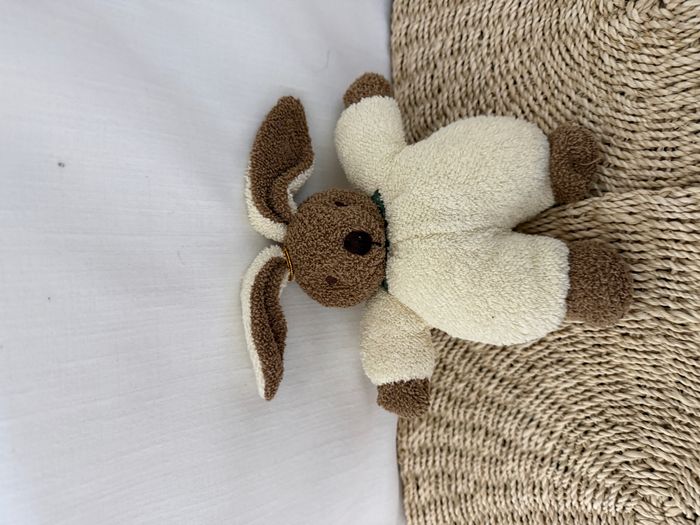 lapin doudou sigikid marron blanc crème vert peluche à grelot  - photo numéro 1