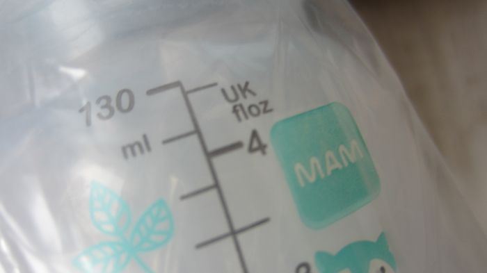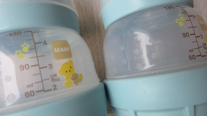 Lot de 2 biberons 130 ml + 1 recharge neuve. Sans tétine. Marque Mam. Lot n° 3