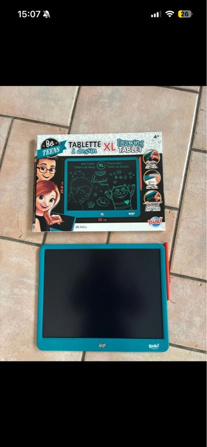Tablette à dessin avec stylet grand format XL de la marque buki Très peu servi Livré avec notice, piles incluses et boîte d'origine Acheté 20 euros chez oxybul Très bon état