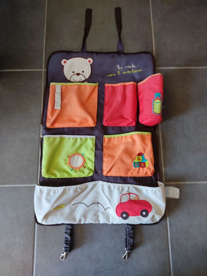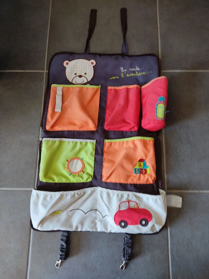 Organisateur voiture en route pour l'aventure avec plusieurs poches avec scratch Peut se plier en 2 comme sur photo 3 Bon état