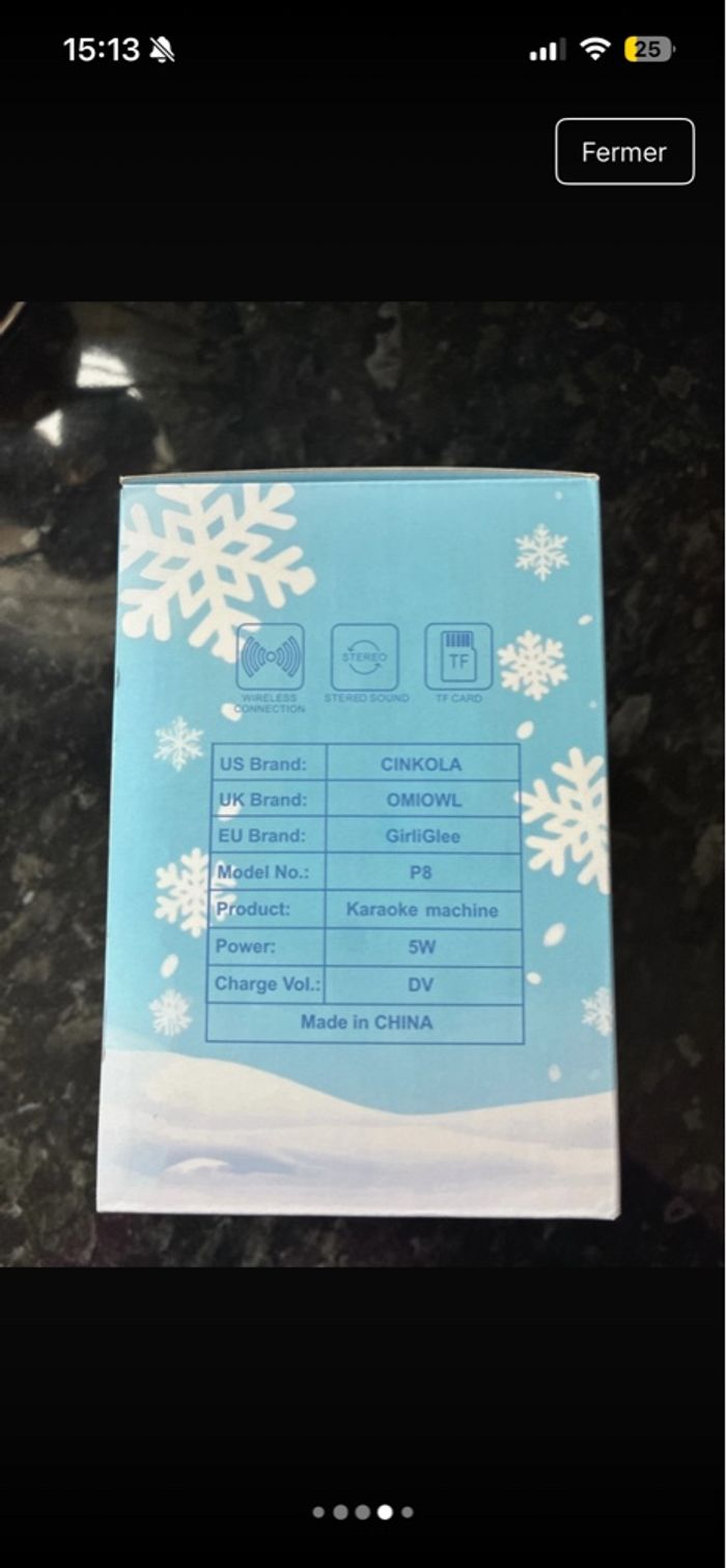Mini Karaoke pour fille, Enceinte Bluetooth avec 2 Micros sans Fil motif reine des neiges Le coffret karaoke est doté de lumières LED multicolores pour créer une ambiance festive. Il combine Bluetooth, carte TF et entrée AUX - idéale comme micro enfant pour chanter ou écouter de la musique. Avec ses 5 effets vocaux rigolos, les enfants peuvent transformer leur voix en robot, monstre ou dessin animé, rendant chaque moment unique. Décorée de châteaux étincelants et de motifs givrés, cette enceinte-microphone pour enfants crée une ambiance de fête glacée. Un jouet parfait dès 3 ans pour vivre des moments musicaux dignes d'un conte de fées. Idéal pour les fans d'univers Frozen et d'histoires enneigées. Cadeau reçu en double pour son anniversaire de 6 ans mais convient à à partir de 3 ans Neuf jamais ouvert Envoi très rapide