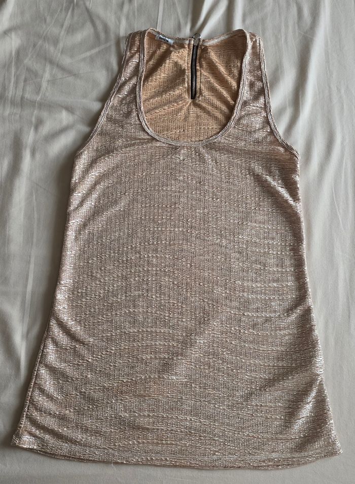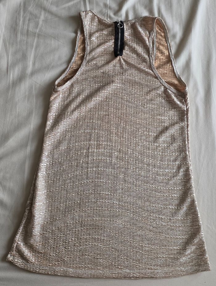 ​✨ ÉTAT : Très bon état. Le tissu est impeccable, sans fil tiré. ​📏 TAILLE & COUPE : Taille M. Coupe débardeur ajustée avec une fermeture éclair noire contrastante dans le dos. ​🌿 MATIÈRE : 100% Polyester. Tissu gaufré et extensible avec un fini métallique doré très brillant. ​📦 LIVRAISON : Envoi via Mondial Relay (lockers), Shop2Shop ou Chronopost (point relais physique). ​🎁 Réductions sur les lots activées ! C'est le moment de craquer pour plusieurs articles.