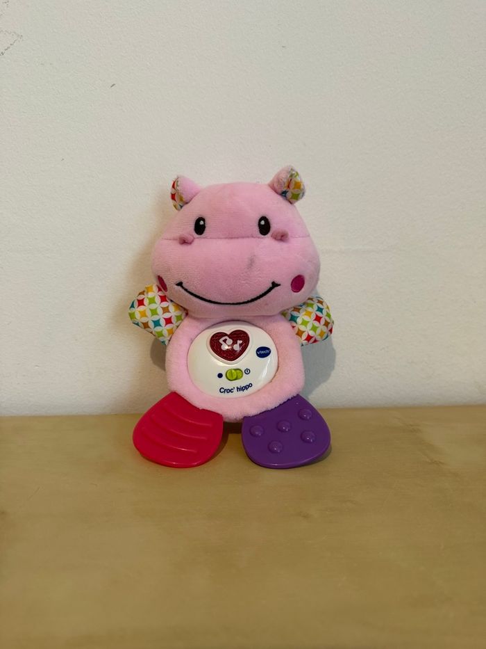 Petite tache sur visage Un hochet musical qui soulage les dents de bébé ! Version française Avec différentes textures pour stimuler vos sens - corps moelleux et pattes arrière en plastique souple Un bouton en forme de cœur lumineux pour déclencher des phrases, des chansons et des mélodies douces Deux pattes à mâcher souples pour soulager les gencives et apaiser les dents de lait Module électronique amovible pour faciliter le lavage de la partie textile (lavage en surface uniquement