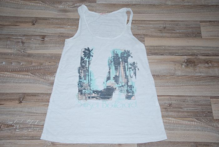 léger et confortable très bon état, debardeur tuniqe camaieu LA los angeles imprimé dessus epaule à epaule 27 cm aisselle à aisselle 38 cm epaule jusqu'en bas 66 cm