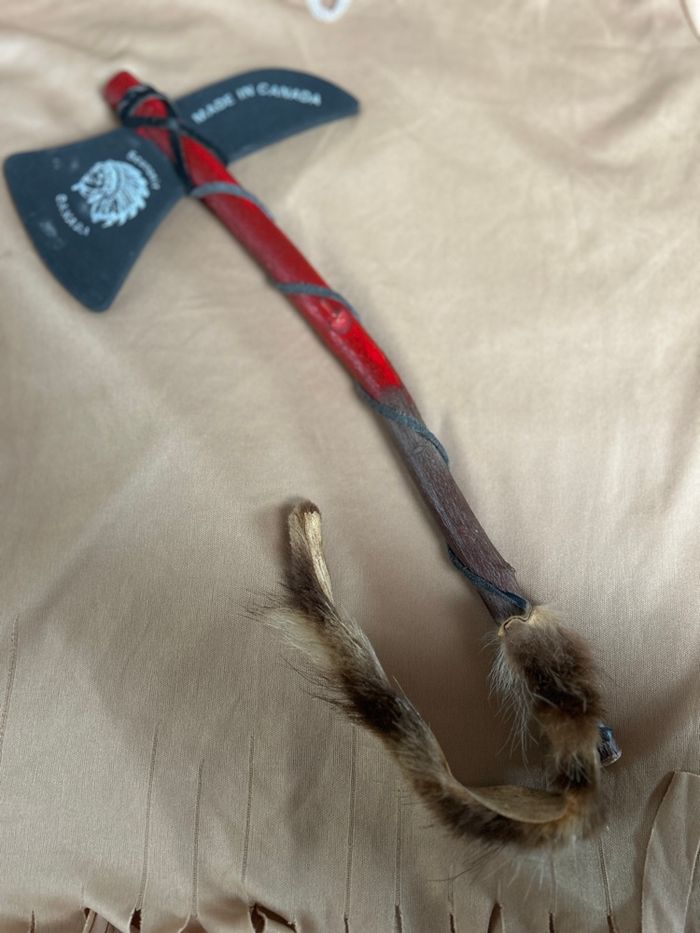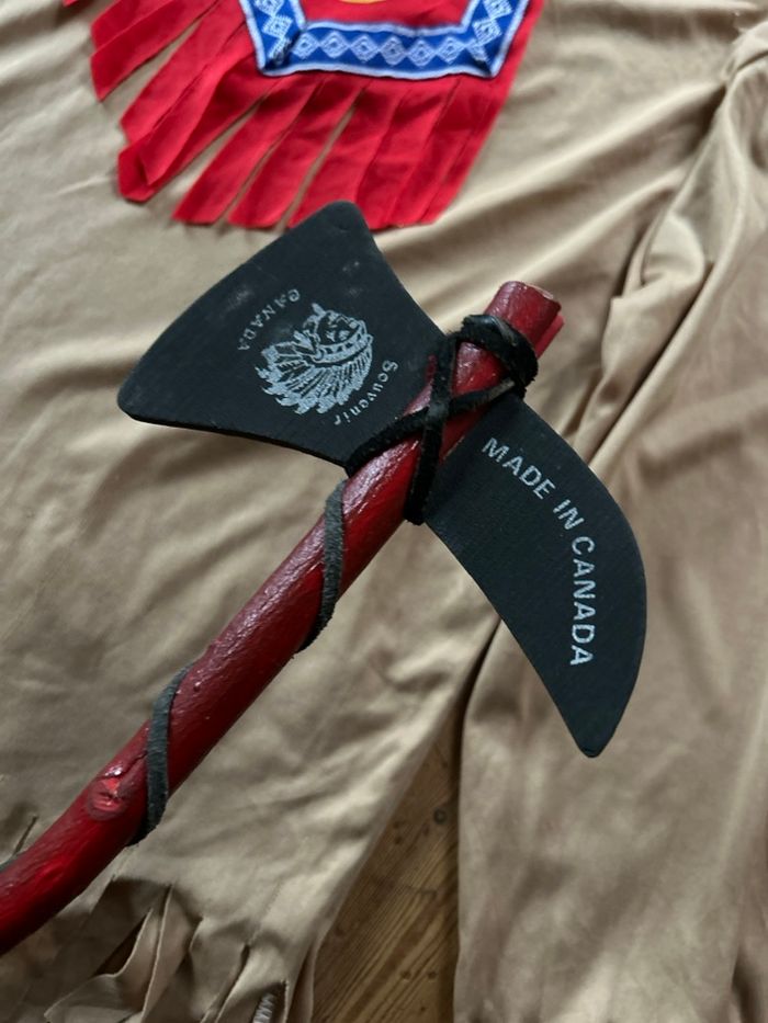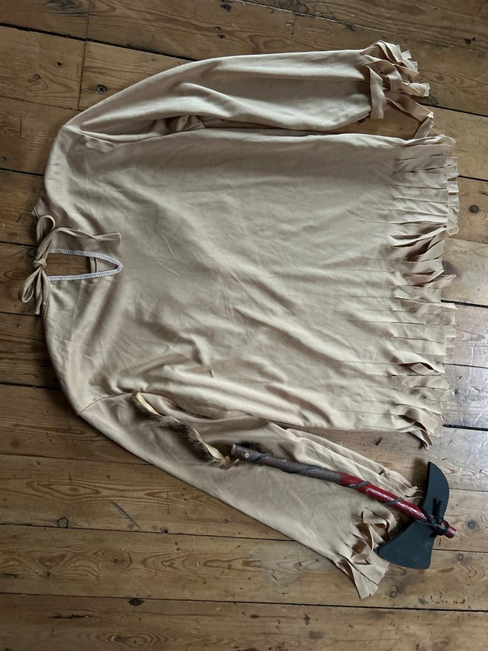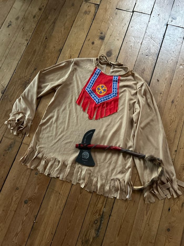 Déguisement indien Taille environ 12 ans , peut convenir aussi pour un 14 ans, voir les mesures . tunique état satisfaisant, échelle en bas au dessus de chaque frange Plus d’étiquette : carrure 37,5 cm Aisselle à aisselle 48 cm Longueur avec les franges 60 cm Une jolie hache en mousse, manche en bois, souvenir du Canada