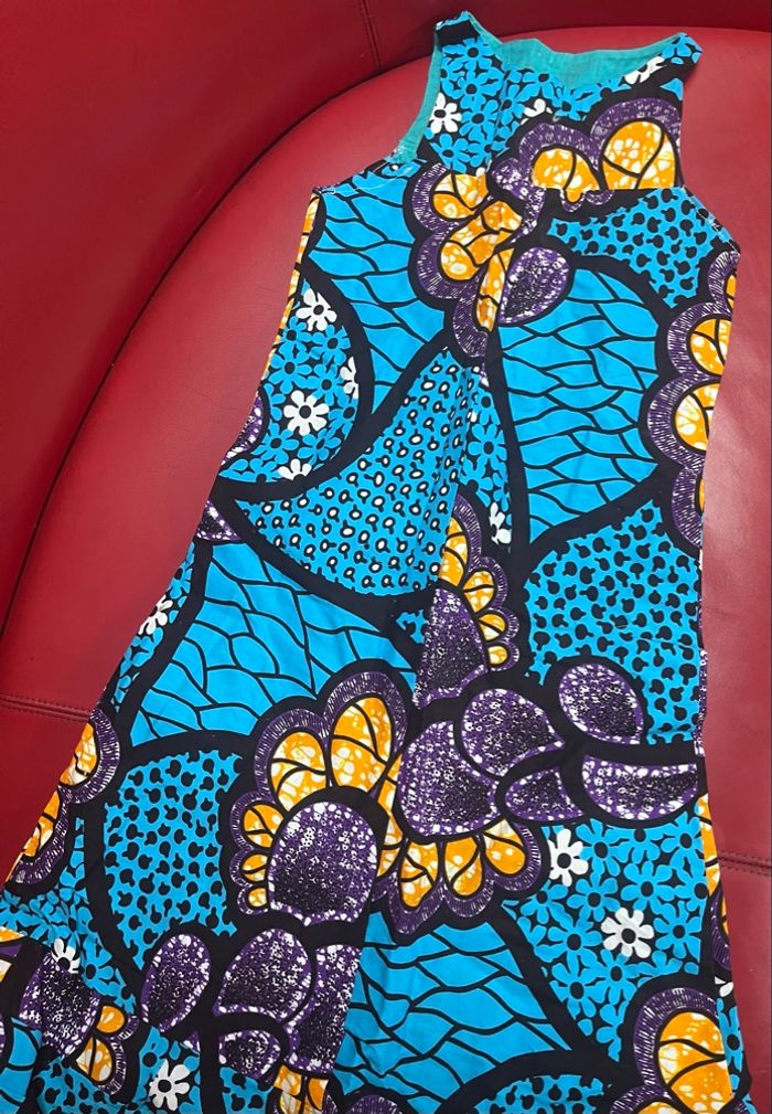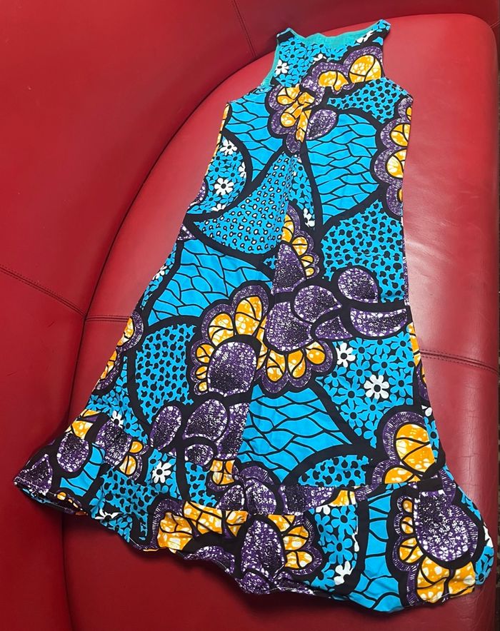 Robe africaine Pour enfant 5/6 ans Couleur bleu avec motifs fleurs multicolores Longueur 78cm Largeur 30cm En bonne état