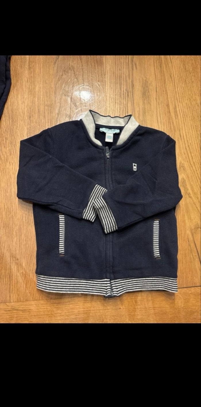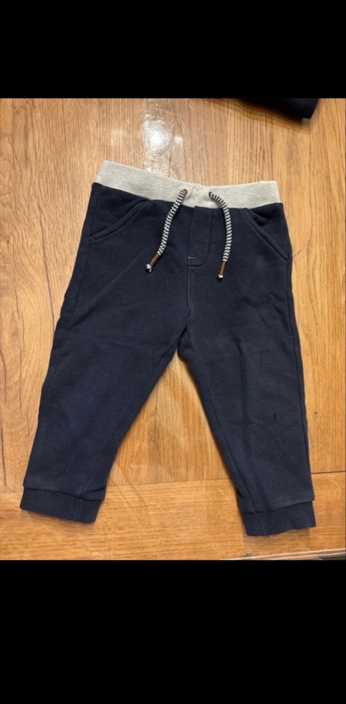 2 jogging + veste. Un petit accroc sur le pantalon bleu mais rien de méchant ( voir photo ). Taille 18 mois