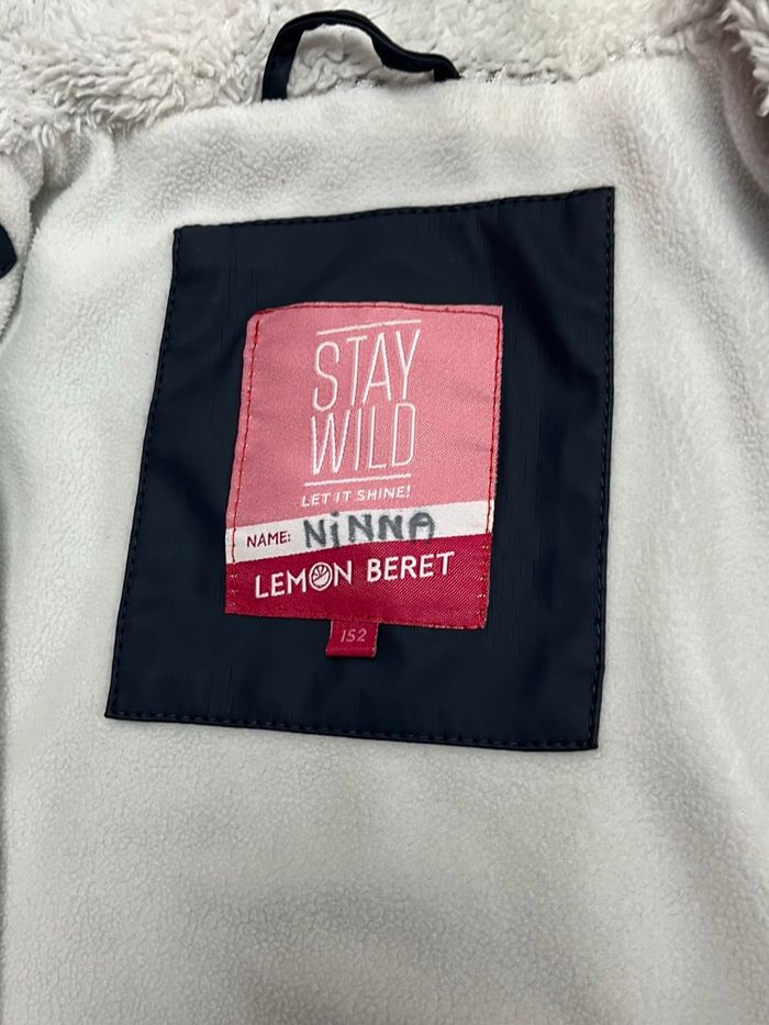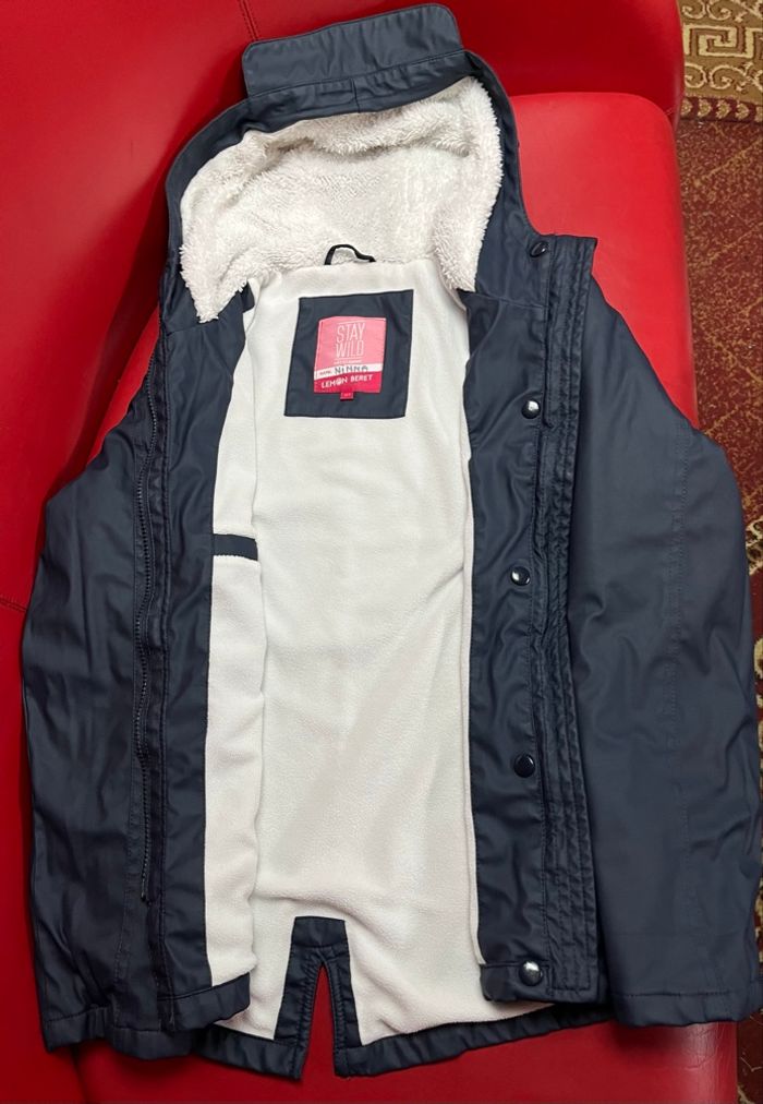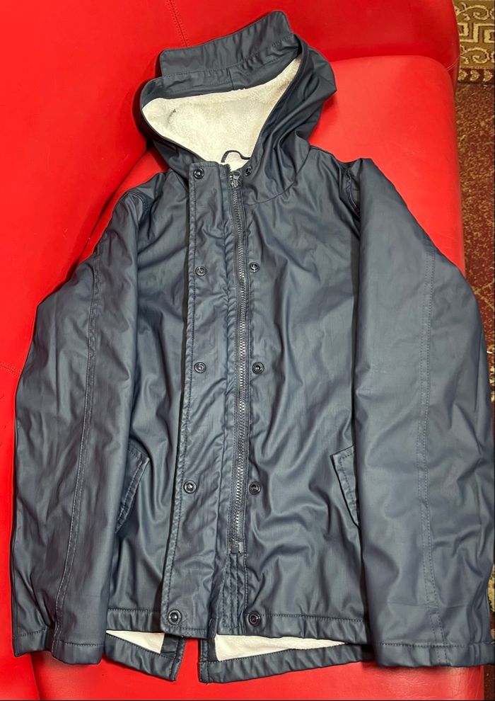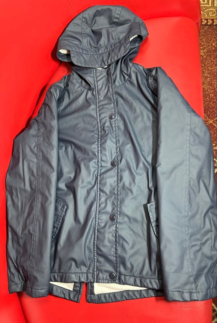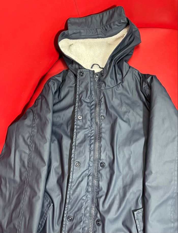 Veste de pluie,imperméable pour enfant Marque Lemon Beret Avec capuche Intérieur fourrée Âge 12ans (152cm) Longueur 63cm Largeur 50cm Fermeture éclair et bouton 2 poches extérieur Couleur bleu foncée En bonne état