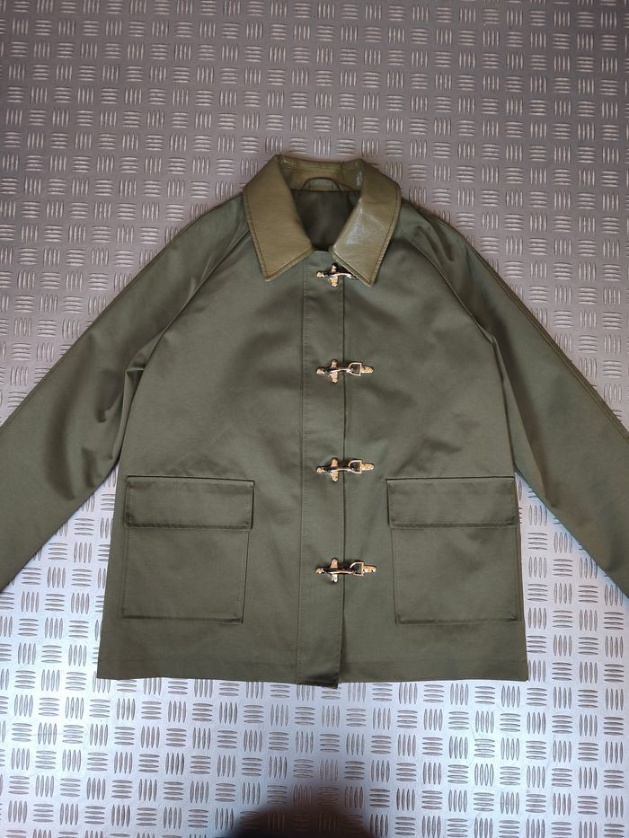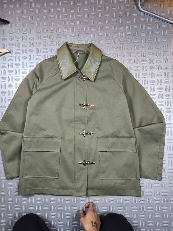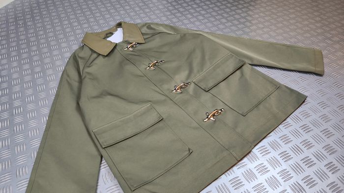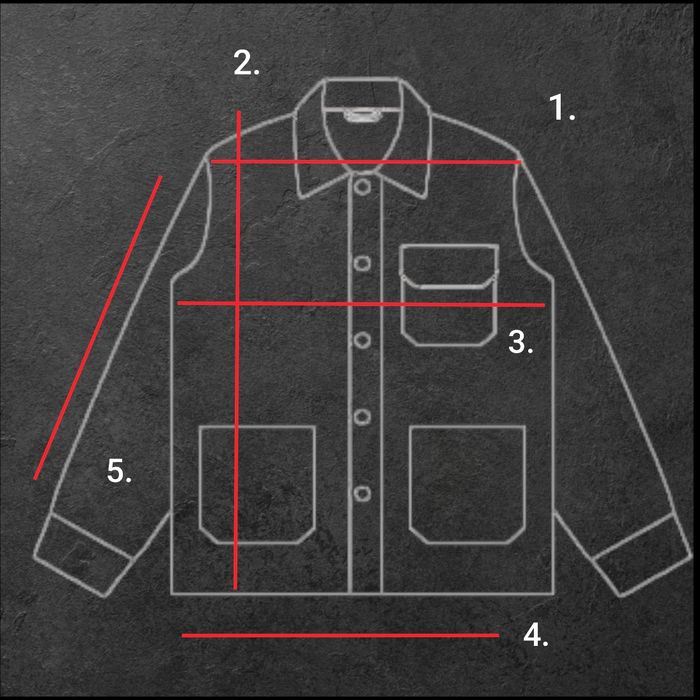 Veste de style fireman japonais en workwear Canva Style avant garde coupe droite ouvert au hanches Fermoir à Crochets metalique et fermeture éclair, Jacket Hook closure japan Tissus déperlant neuve avec étiquette Mesure à plat en centimètre (Cm) 1. 2. 3. 4. 5. Schéma de mesure en description