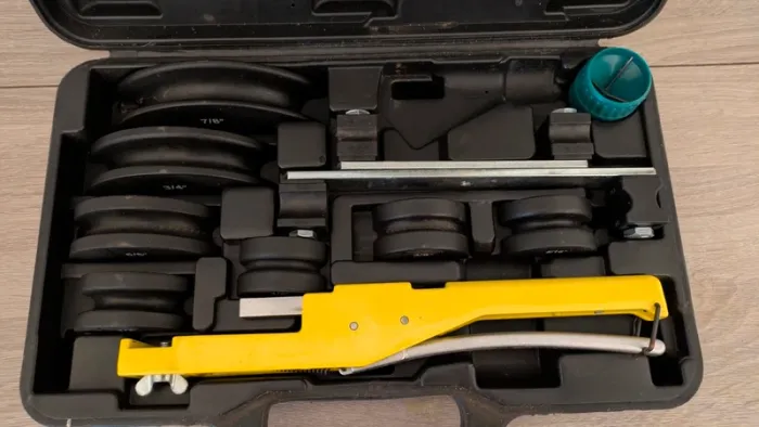 Coffret cintreuse arbalète Teddington Avec ébavureurs intérieur/extérieur formes : 1/4 , 5/16 , 3/8 , 1/2 , 5/8 , 3/4 , 7/8 Marque : ***** Teddington ***** !!!!!!!!!! Manques juste le coupe Tube !!!!!!!!!!