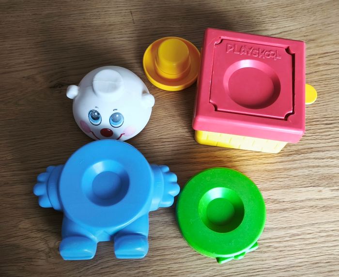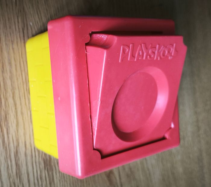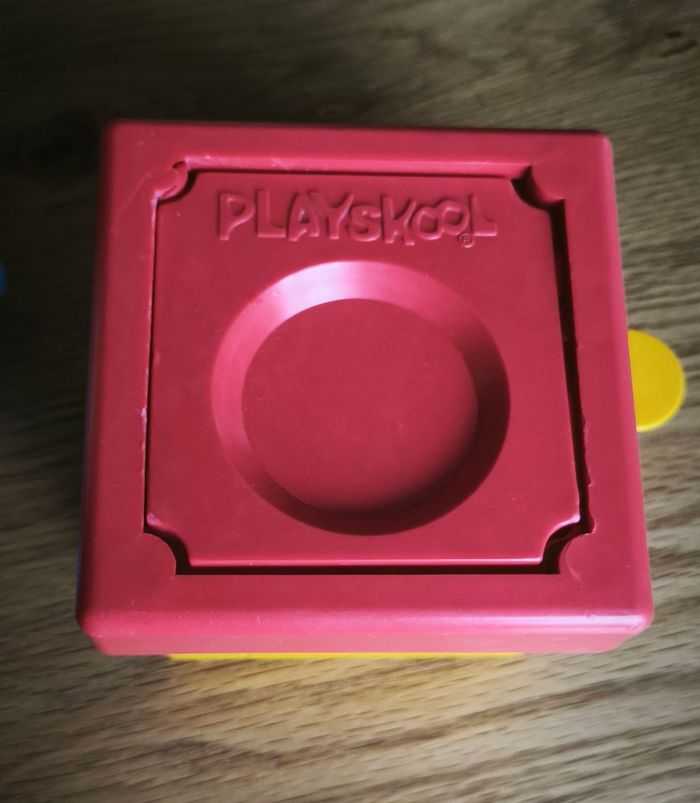 Jeu des années 80 (introuvable) Formé de 4 pieces pour apprendre à former un bonhomme . Apprendre aussi les couleurs . L'enfant pose les pièces sur le socle et appuie sur la manette et les pièces sautent et recommence à l'infini. Pas de piles 😌 Pas de son bruyant 👍 Traces d'usures , car servi à plusieurs générations ☺️ mais toujours fonctionnel