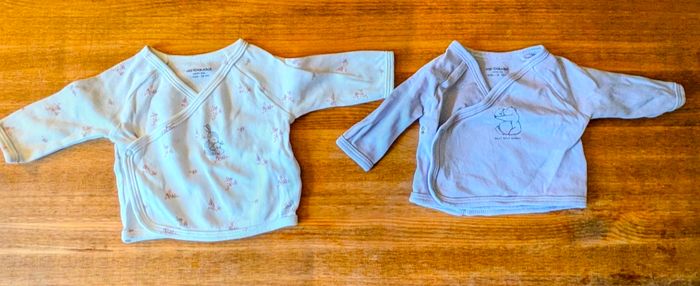 Deux gilets en coton bio achetés pour la maternité. Ouverture croisée. Taille 1 mois et naissance. Jamais portés. Idéal pour le printemps ou été.