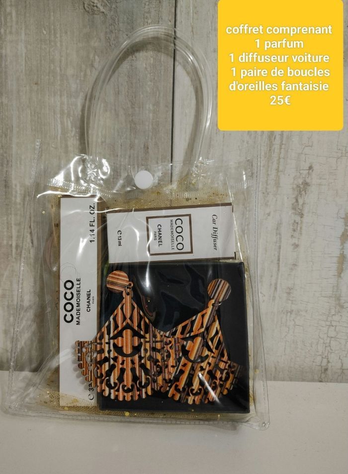 Coffret femme neuf comprenant 1 parfum 1 diffuseur voiture 1 paire de boucles d'oreilles