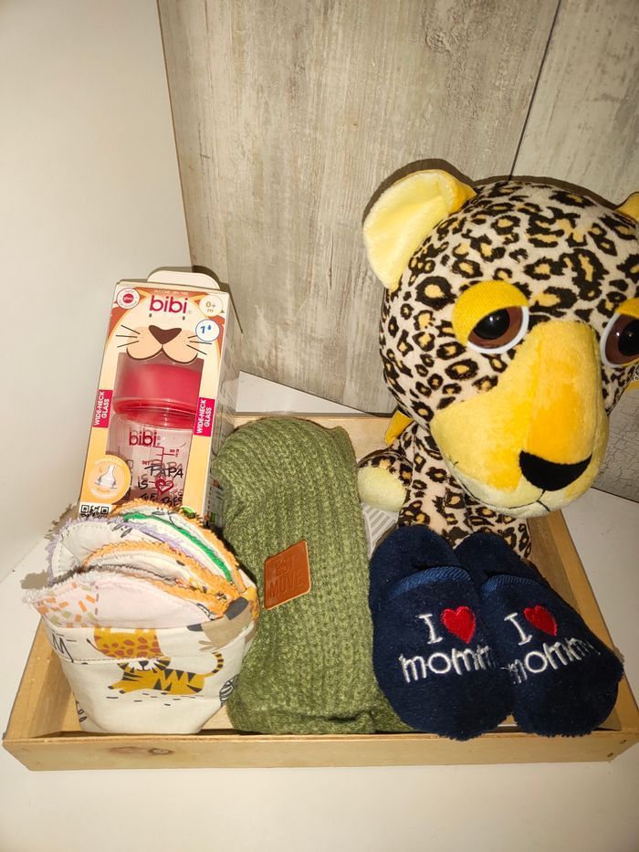 Coffret naissance neuf comprenant 1 peluche 1 paire de chaussons bébé 1 biberon 1 panier avec des lingettes lavables 1 écharpe