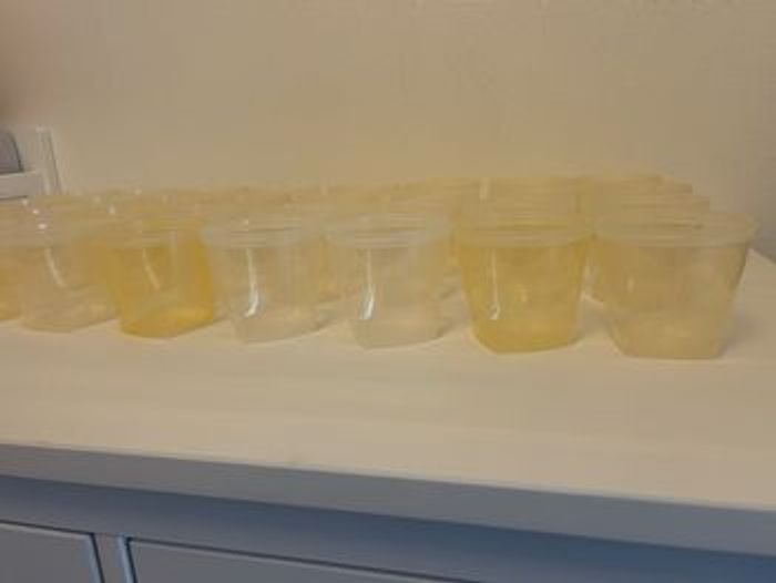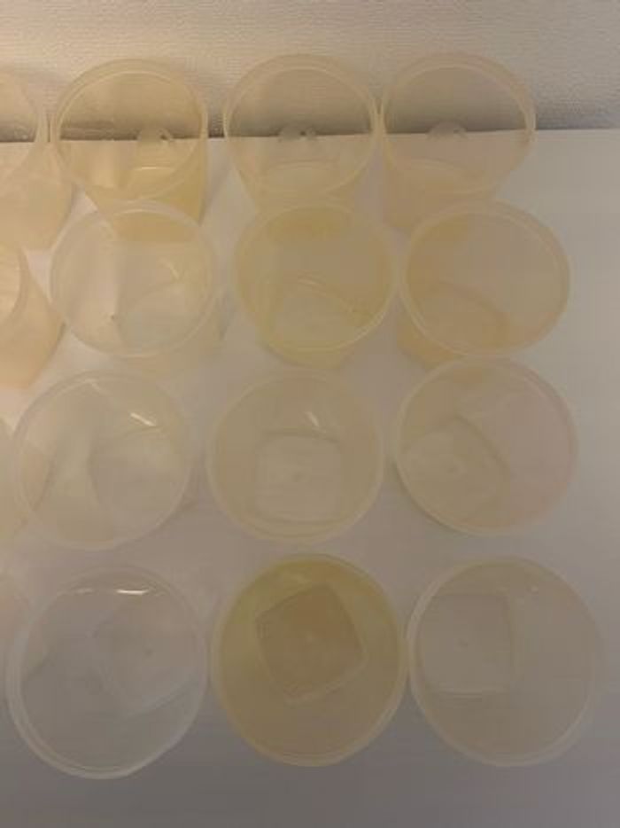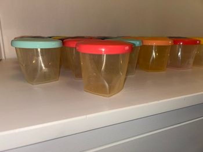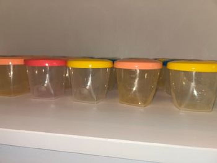 33 Pots babybols babymoov 250ml 33 couvercles Couvercle à visser possible de noter au marqueur et d’effacer ( aucune trace de marqueur) Les pots ont des marques de vécu et certains S ont jaunis par la nourriture ne gêne en rien l’utilisation