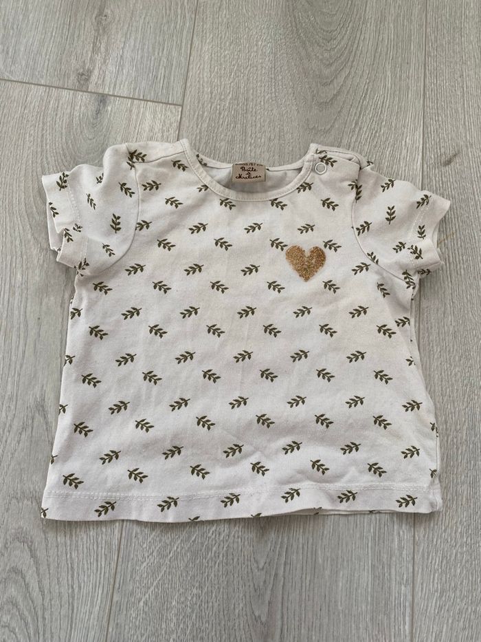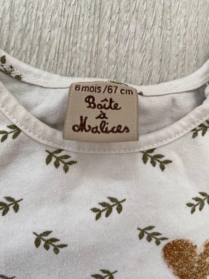 T-shirt à manches courtes Boîte à malices Taille 6 mois Très bon état Les paillettes sur le cœur sont un peu effacées Boutons sur l’épaule