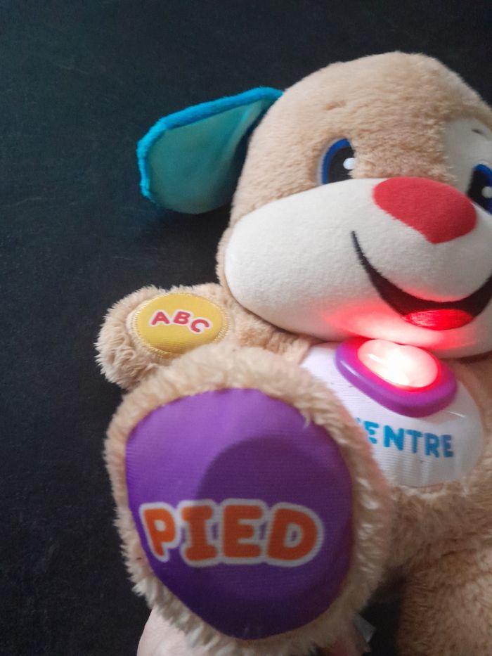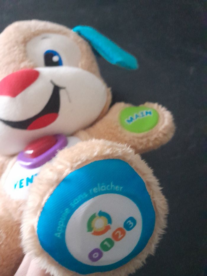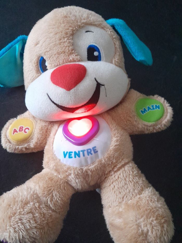 Peluche à câliner Puppy fisher price. Réagit au touches des mains, pieds, oreilles, ventre. Plusieurs niveaux d'apprentissage. De nombreuses musiques, lumineux au niveau du cœur. En très bon état, fonctionne parfaitement