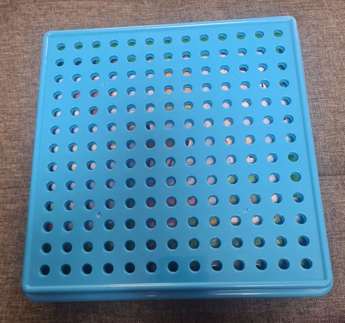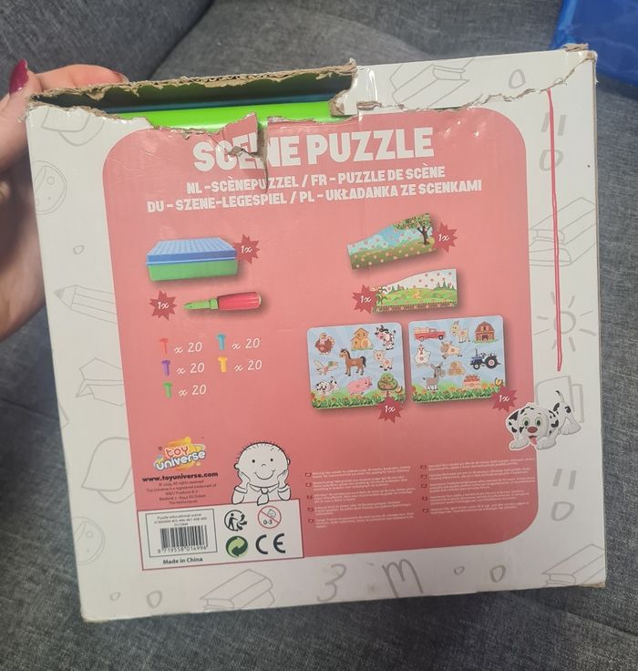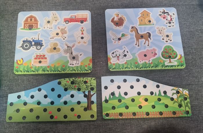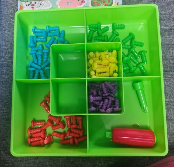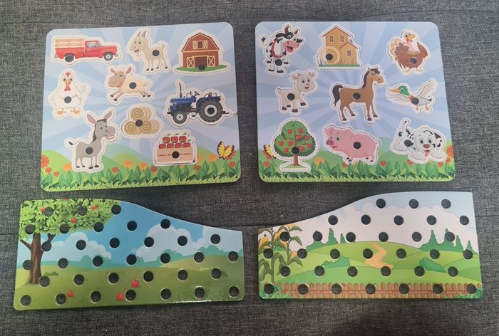 A partir de 3 ans l'enfant va s'amuser de longues heures avec ce jeu qui est vraiment top pour la motricité fine et imaginer des scènes à l'infini, grâce à toutes les images et les décors fourni dans la boîte qui sert de support avec des pré-trous pour fixer dessus et laisser parler sa créativité et son imagination. En plus de la boîte plastique, il disposent de sa boîte d'origine en carton qui malheureusement est abîmer. Elle contient : Une boîte plastique à compartiment et plateau de jeu sur le dessus Un tournevis vert et rouge cruciforme Deux grandes plaques paysages 18 petits socles à fixer à l'aide des vis ( maisons, arbre, pommes, foin, et divers animaux....ect) 20 vis rouge 20 vis violet 20 bleu 20 vis vert 20 vis jaune Le jeu est complet est en bonne état juste qu'elle que petits défaut du a l'utilisation que j'ai mis en photo rien de bien méchant