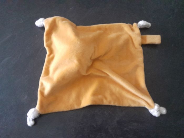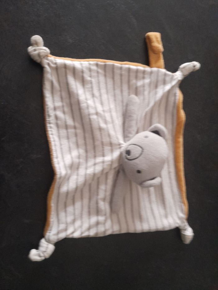 Doudou prémaman de couleur unie moutarde d'un côté, rayé blanc et gris de l'autre