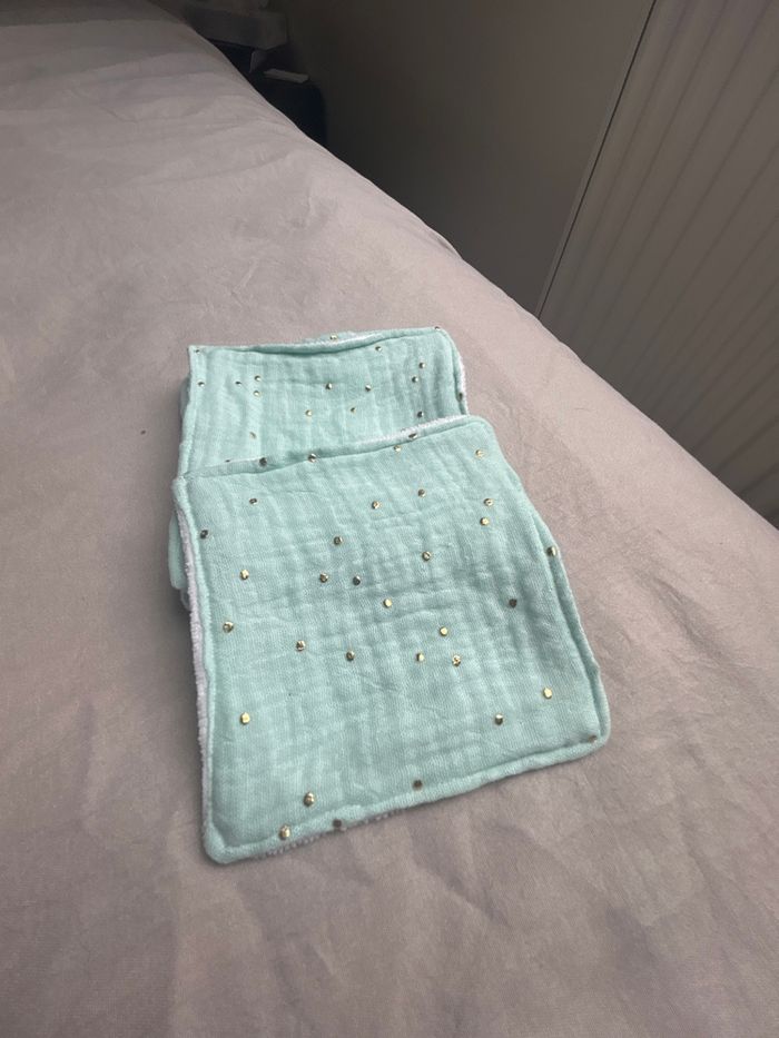 5 carrés lavable idéal pour changer bébé ou se démaquiller par exemple Neuf Côté en éponge blanche et un double gaze de Cotton vert d’eau et perles dorées