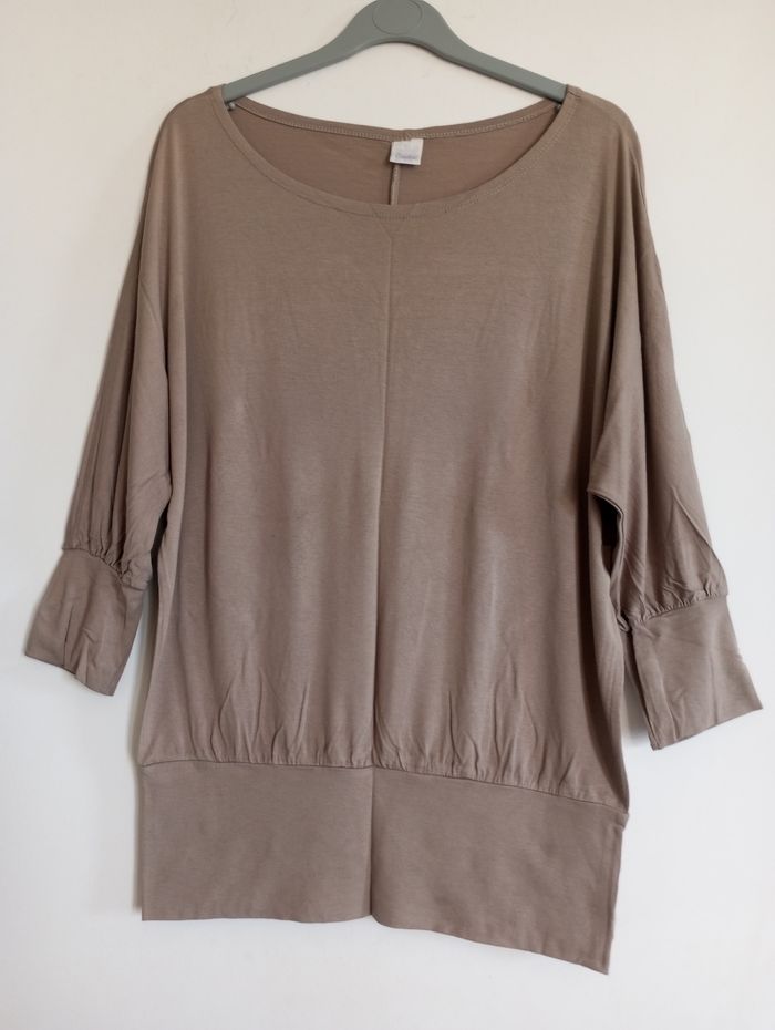 Très bon état, haut large avec manches chauve-souris 3/4, couleur marron clair. Taille unique qui correspond à un 38/40