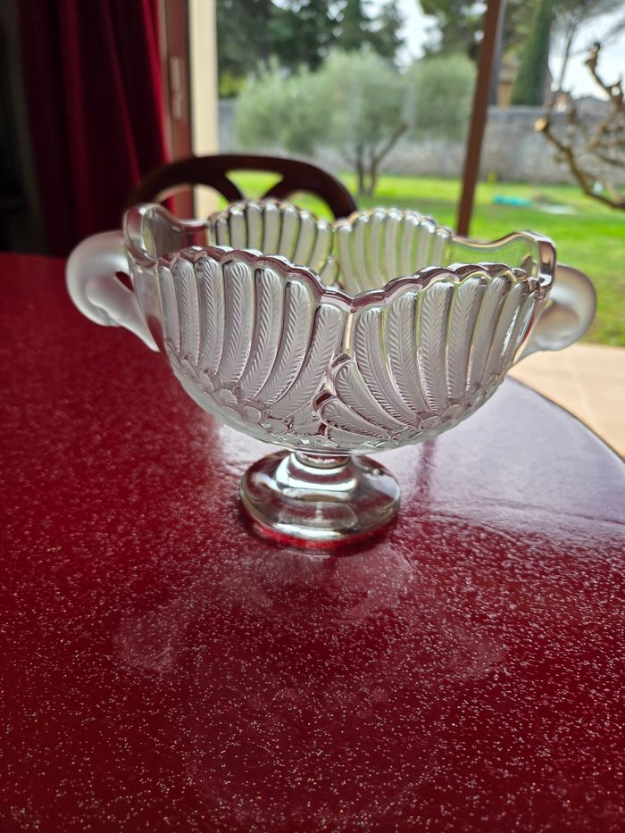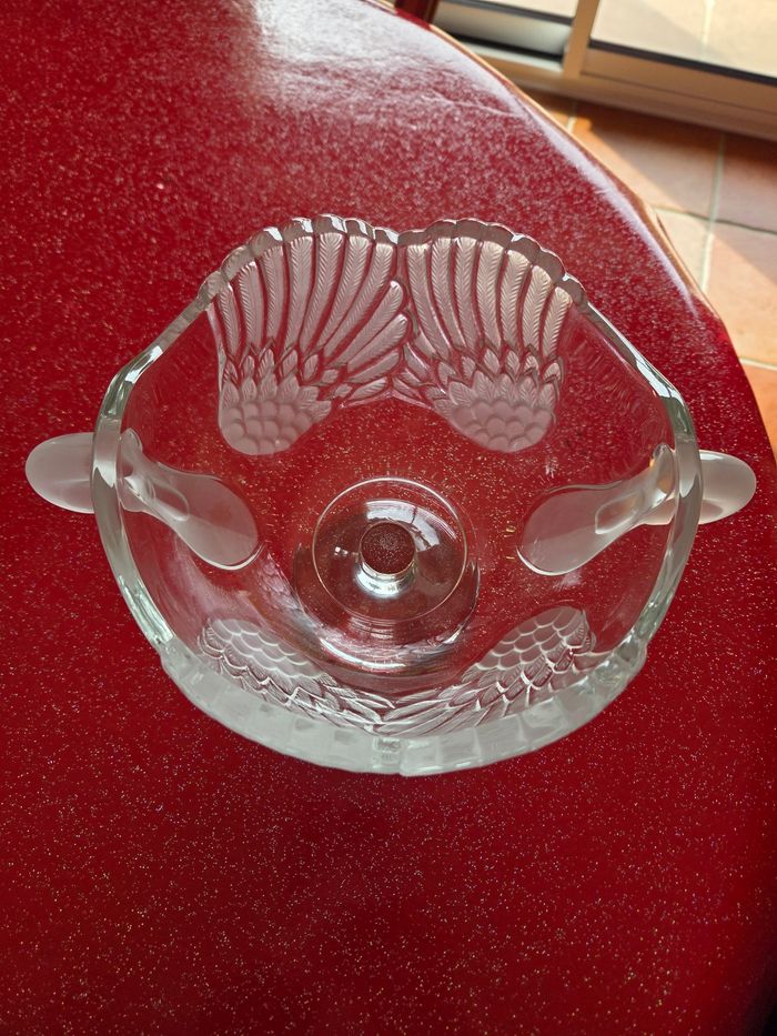 Coupe à fruits "Schwanensee" (Lac des Cygnes) – Cristal d'Art – Vintage 80 Magnifique coupe à fruits sur pied en cristal de haute qualité, modèle Schwanensee (Le Lac des Cygnes). Fabriquée en Allemagne (Made in Germany), cette pièce iconique des années 80 allie finesse et poésie. ​ Le design est particulièrement travaillé : • ​Le corps de la coupe est sculpté pour représenter les ailes déployées du cygne. • ​Les anses sont délicatement façonnées en têtes de cygnes. • ​Le décor offre un superbe contraste entre le cristal transparent et le cristal dépoli (satiné). ​ Dimensions : • ​Diamètre : 18,5 cm • ​Hauteur : 15 cm ​ État : L'article est en très bon état, le cristal a gardé tout son éclat. ​Une pièce de centre de table très raffinée, idéale pour une décoration classique ou pour un collectionneur de verrerie d'art.