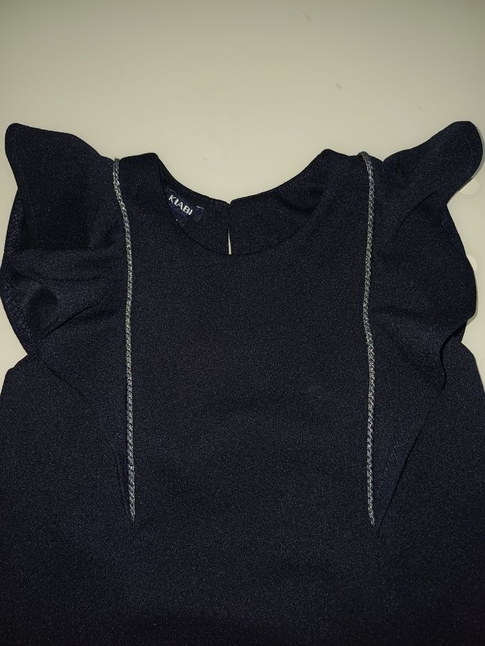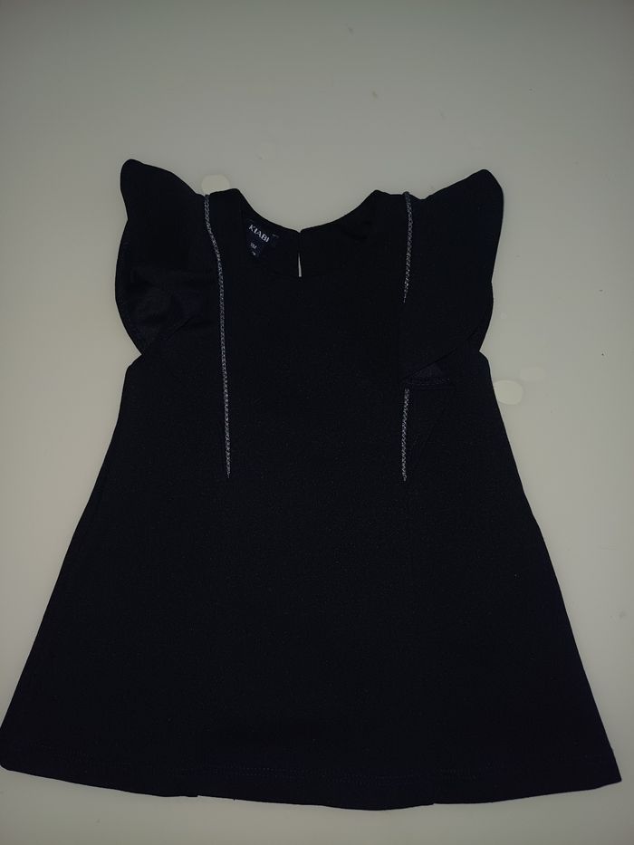 Très jolie robe à manche courte neuve de couleur bleu marine et s'attache avec un bouton dans le dos voir la photo ci jointe. La marque est KIABI et la taille 9 mois.