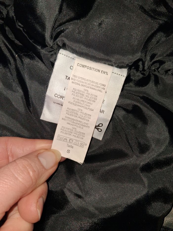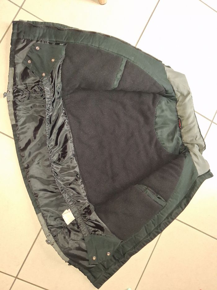 Bon état géneral Recousu proprement et solidement sous l'aisselle droite. 2 poches intérieures à scratch. ceinture réglable à l'intérieur (cordon de serrage + accroches pressions). fermetures éclairs (2 poches extérieures et zip) fonctionnelles.