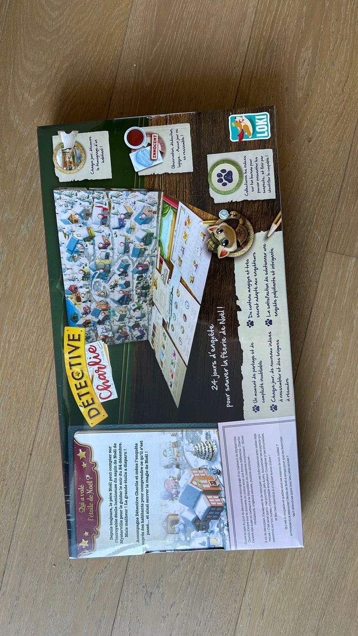 Calendrier de l'Avent / Jeu Détective Charlie de Loki NEUF Le calendrier de l'Avent Détective Charlie de Loki, est un coffret offrant une expérience ludique conçu pour aider les jeunes détectives dès 7 ans à patienter jusqu'à Noël. Depuis toujours, le père Noël peut compter sur l’incroyable étoile lumineuse du sapin de Noël de Mysterville pour le guider le soir du 24 décembre. Mais malheur ! La grande étoile a disparu ! Chaque jour, une case à ouvrir pour découvrir le témoignage d’un habitant de Mysterville. Une énigme quotidienne à résoudre grâce aux indices variés pour avancer dans l’enquête ! Du matériel surprenant vous attend : filtres révélateurs, origamis secrets, puzzles atypiques… 1 calendrier avec 24 cases, des objets à découvrir au cours de l'enquête Nombre de joueurs 1 à 4 Durée de la partie : 15 minutes Âge : dès 7 ans Dimensions de l’article : L55 x l30 x h6 cm Etat : neuf Prix : 22 euros Remise en mains propres sur Paris 11ème ou envoi via un relais (pas de locker) #neuf #noel #enfant #jeu