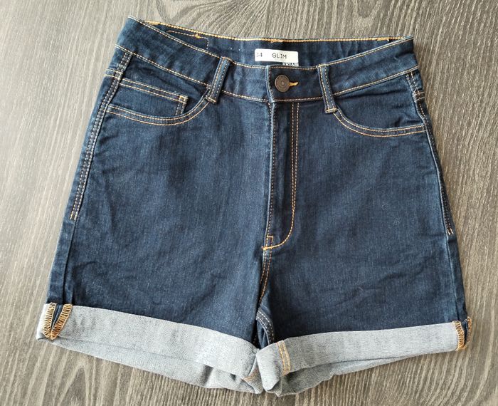 Beau short en jean bleu foncé, avec revers. Coupe slim. Taille : 34 XS Marque : Kiabi NEUF