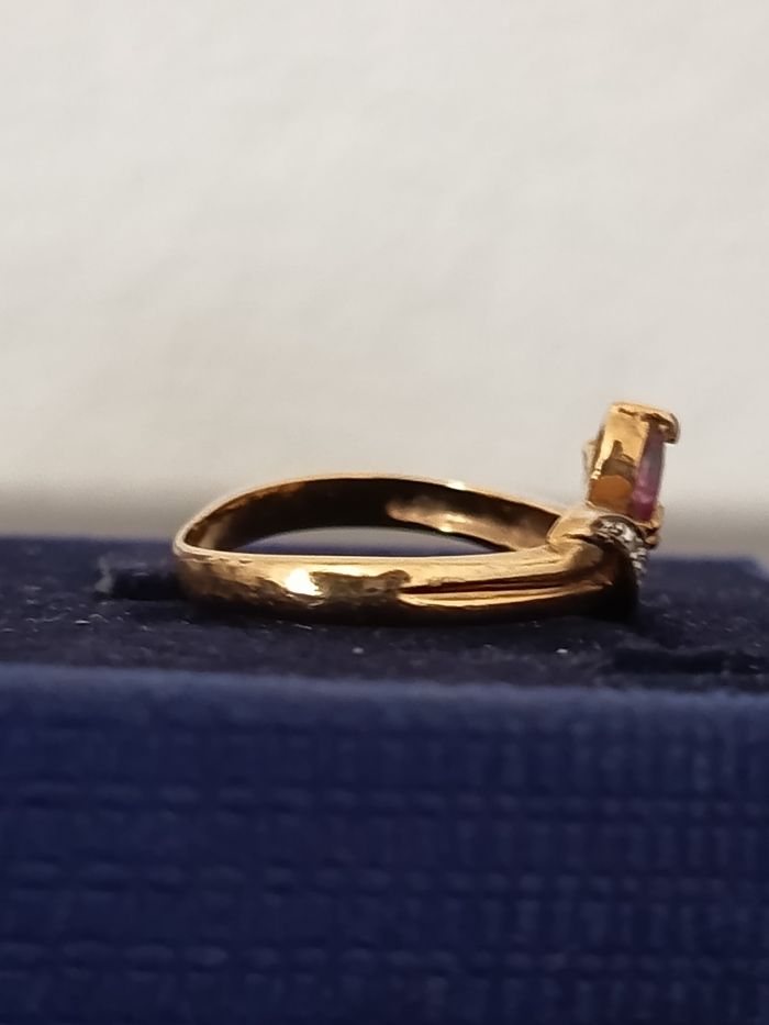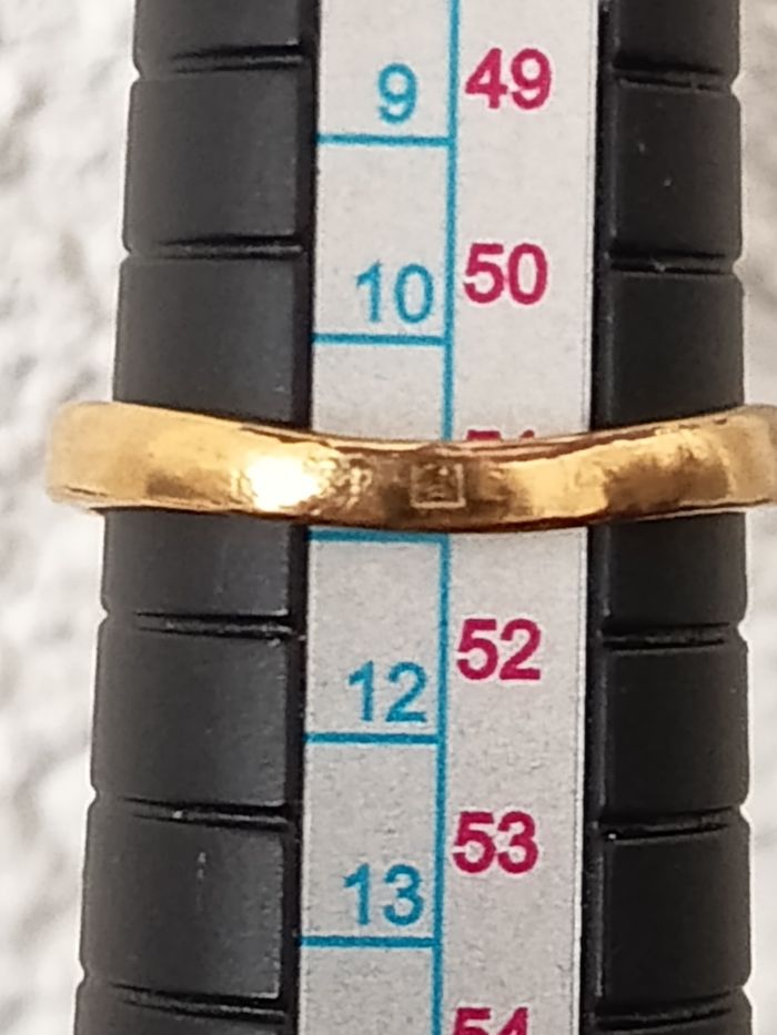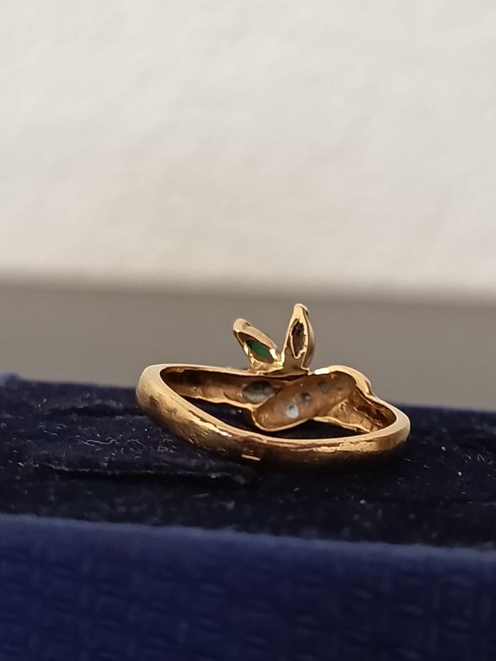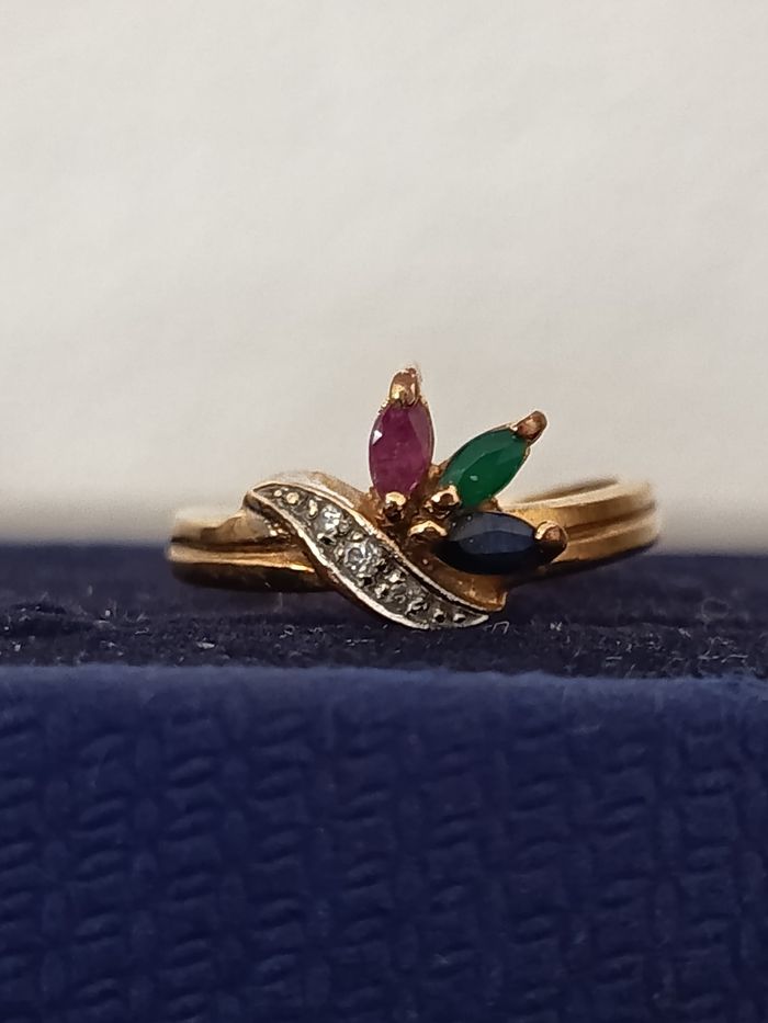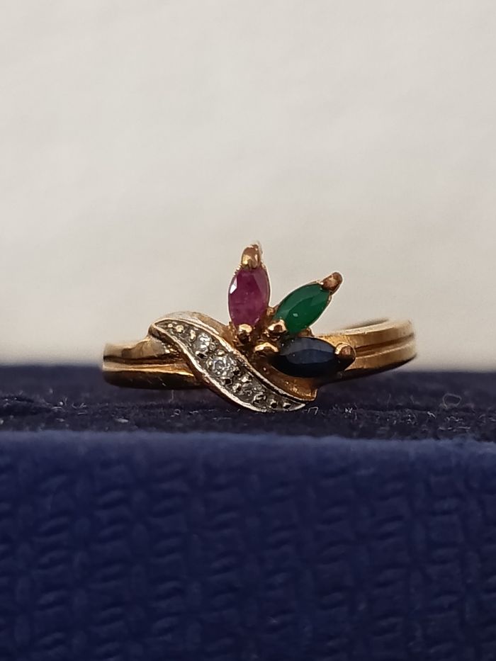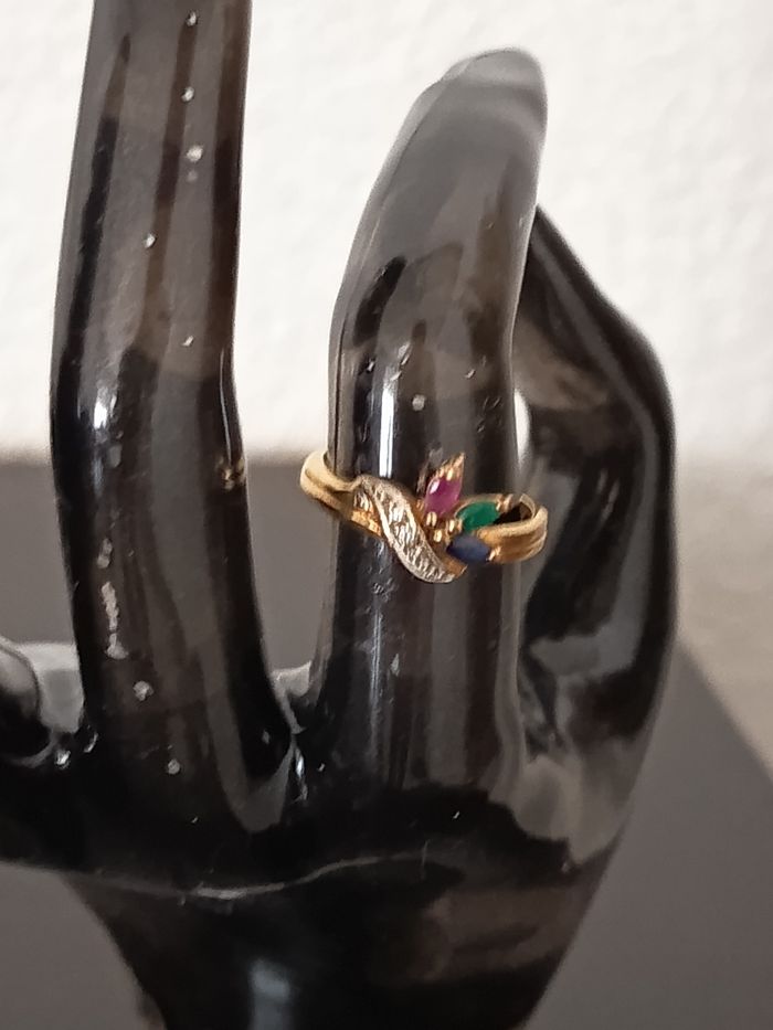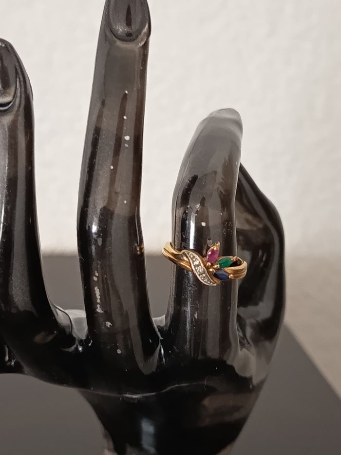 Bague plaqué or ornée de cinq pierres ( zirconiums blanc, émeraude, onix et quartz rose). Taille 51. Poinçon. Petite trace d usure dernière la bague. Bon état.