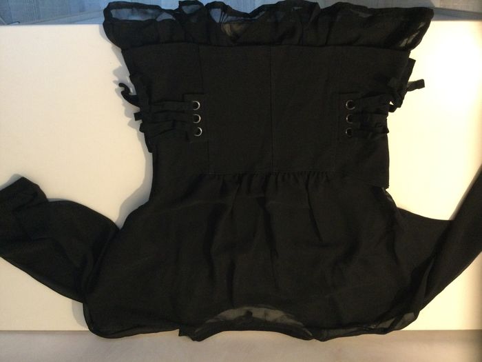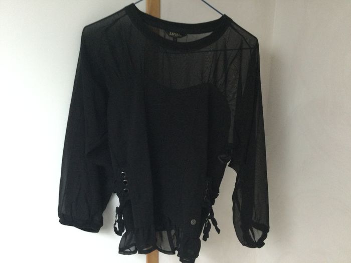 Top noir. Manches, haut du dos et épaules en voile, le reste en coton élastique. Lacets au niveau de la taille sur les côtés . Peut être porté sur une tenue habillée ou décontractée.