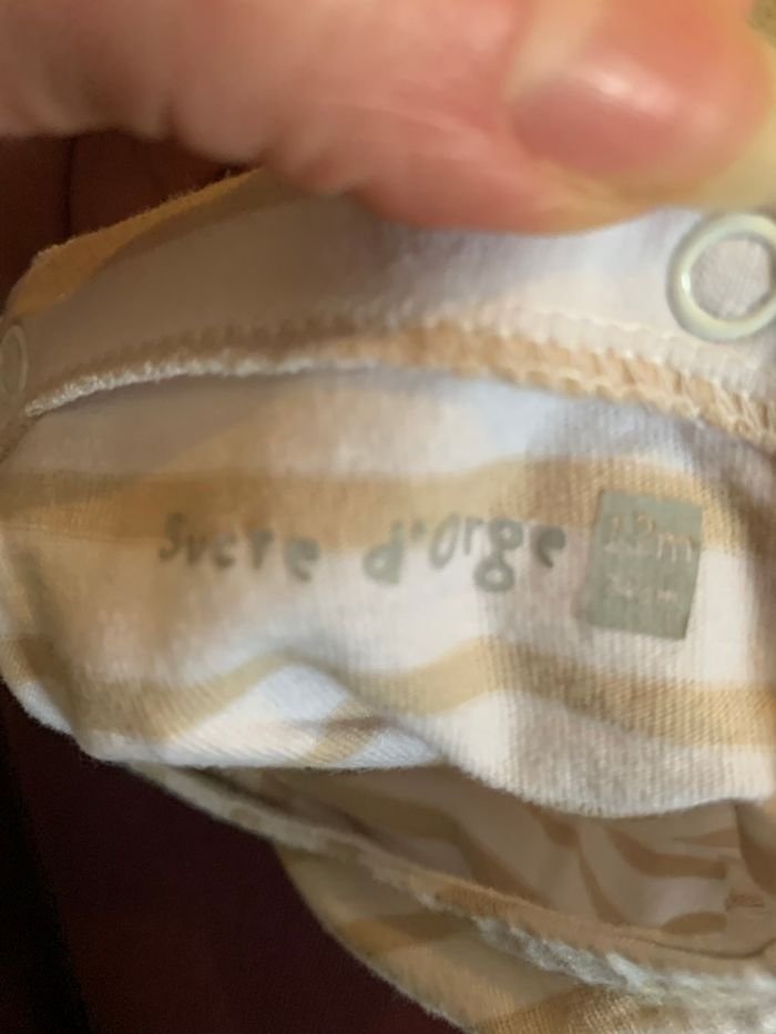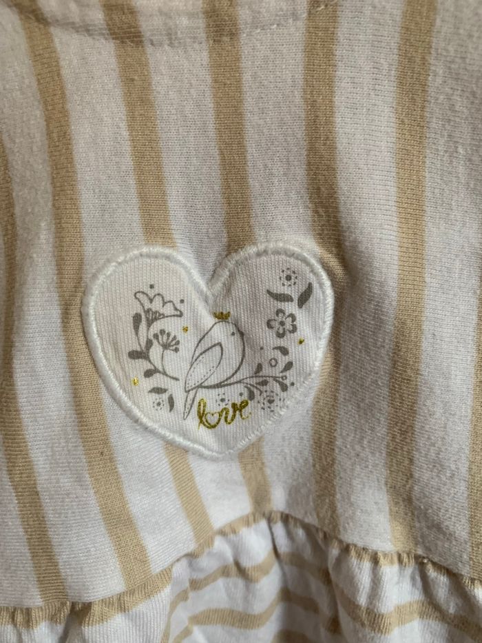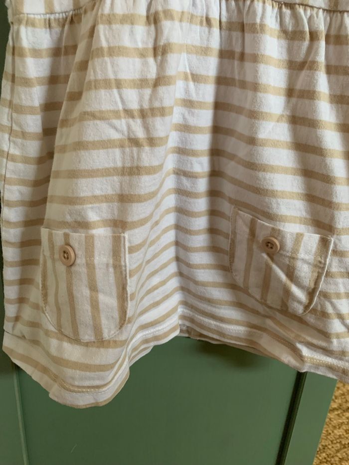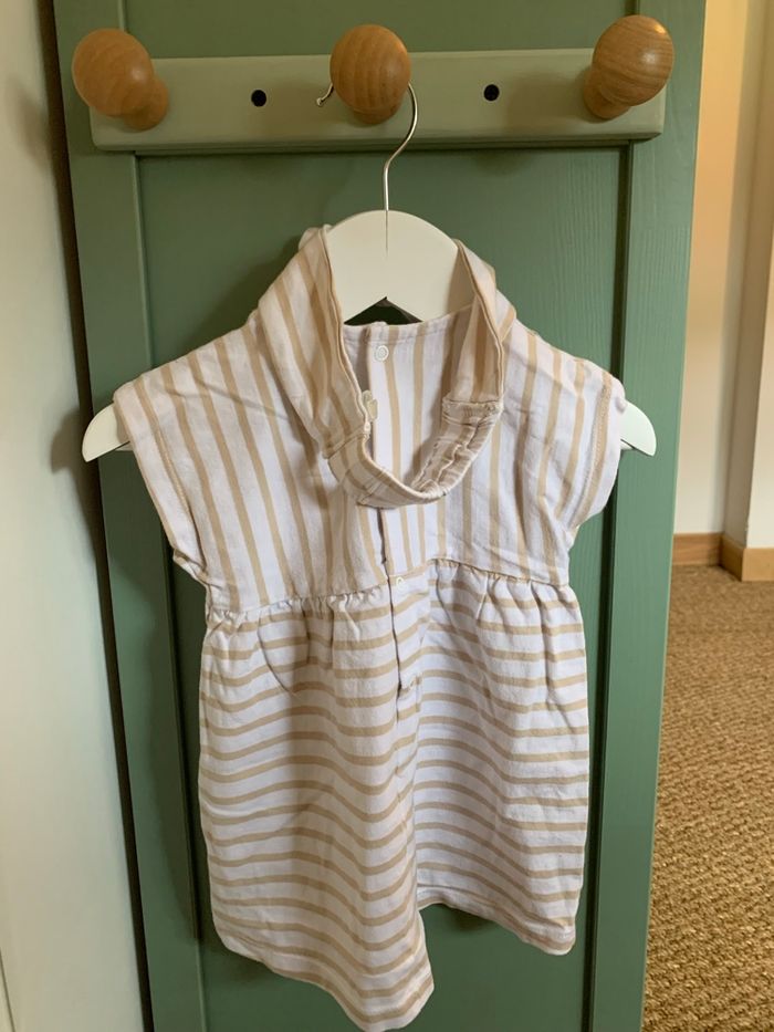 Robe à manches courtes motifs rayures beige et blanc. Motif brodé sur la poitrine. Coupe ample, avec deux poches. Boutons pressions dans le dos. Bandeau assortis Marque : Sucre d’orge Taille : 12m Peu portée elle est en excellent état sans tache ni trous.