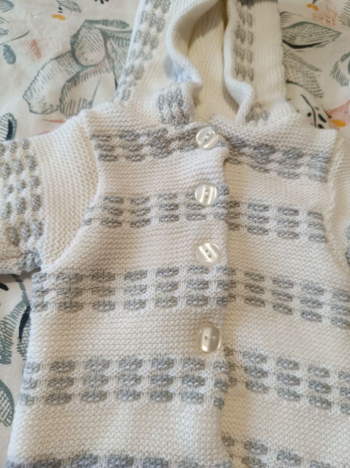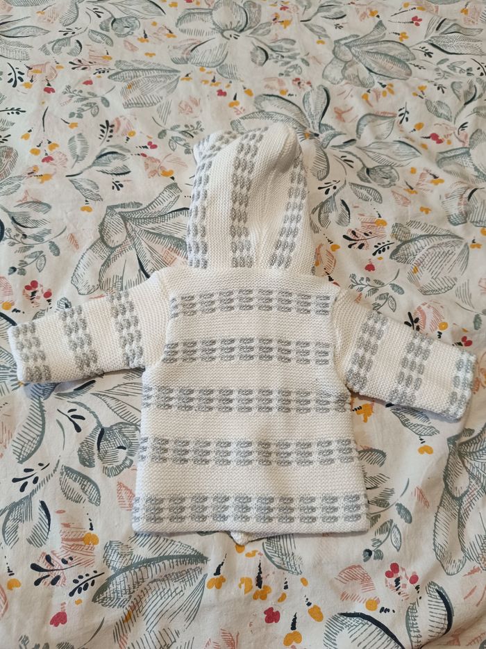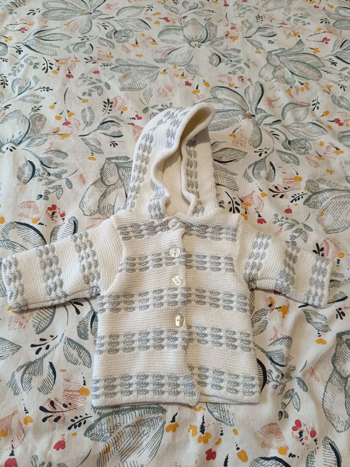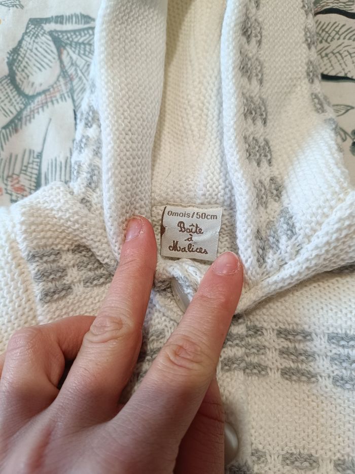 Bonjour, Je vends ce gilet en laine de la marque Boîte à malices en taille 0 mois (Naissance).