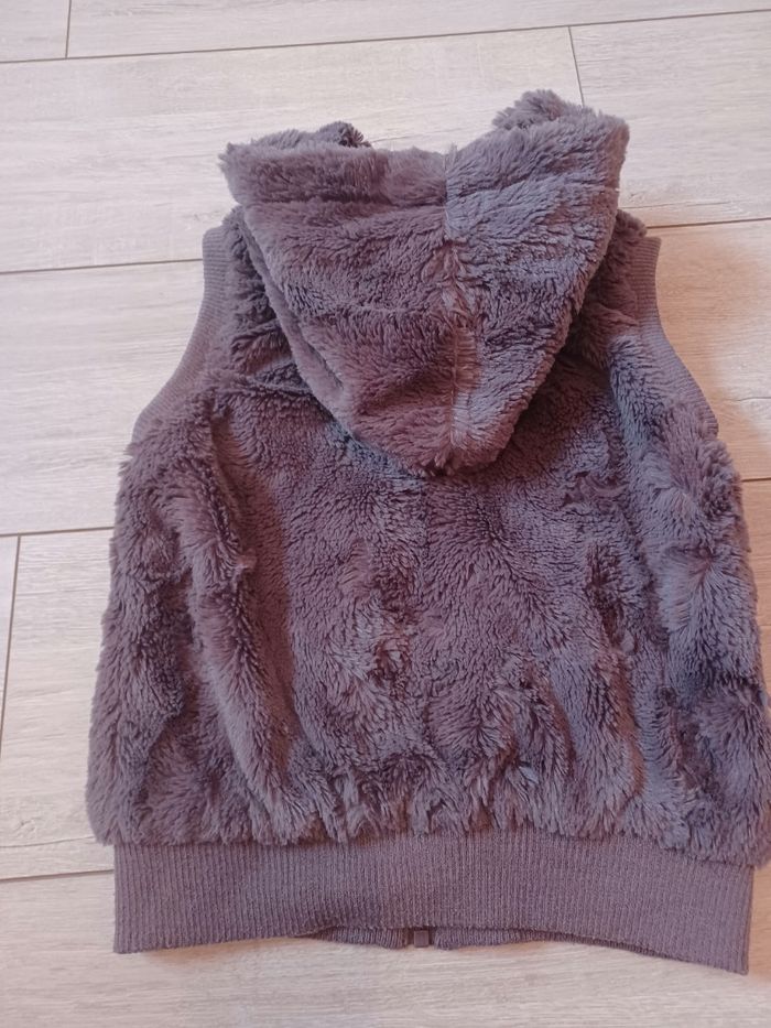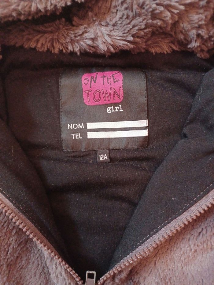 Gilet moumouté avec poche et capuc⁶he, sans manche, doublé. Marque On the ton girl, en 12 ans. Couleur un peu plus foncée que sur les photos. Très bon état.