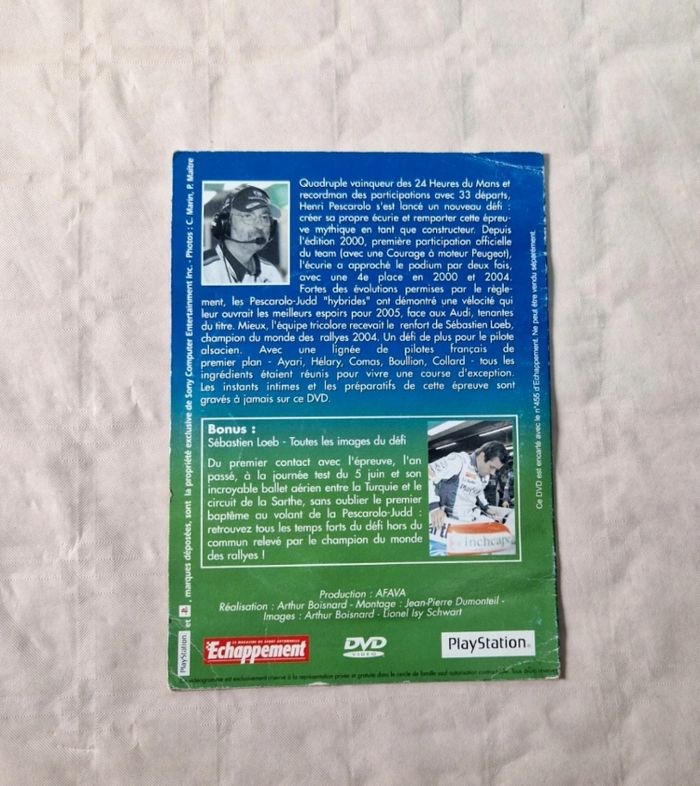 Bonjour, Je propose ce DVD documentaire sur les 24 Heures du Mans 2005, produit par le magazine Echappement en collaboration avec PlayStation. ​Détails de l'objet : Contenu : Le DVD retrace l'aventure du Team Pescarolo Sport lors de l'édition 2005. Il inclut en bonus "Sébastien Loeb : Toutes les images du défi". État physique : Très bon état général , légère usure de la pochette. Complétude : Vendu avec sa pochette cartonnée d'origine et le disque DVD. #LeMans24 #Automobile #SportAuto #SebastienLoeb #Documentaire #PlayStation