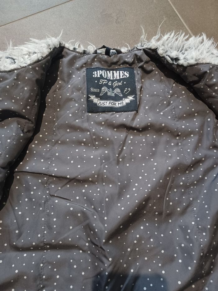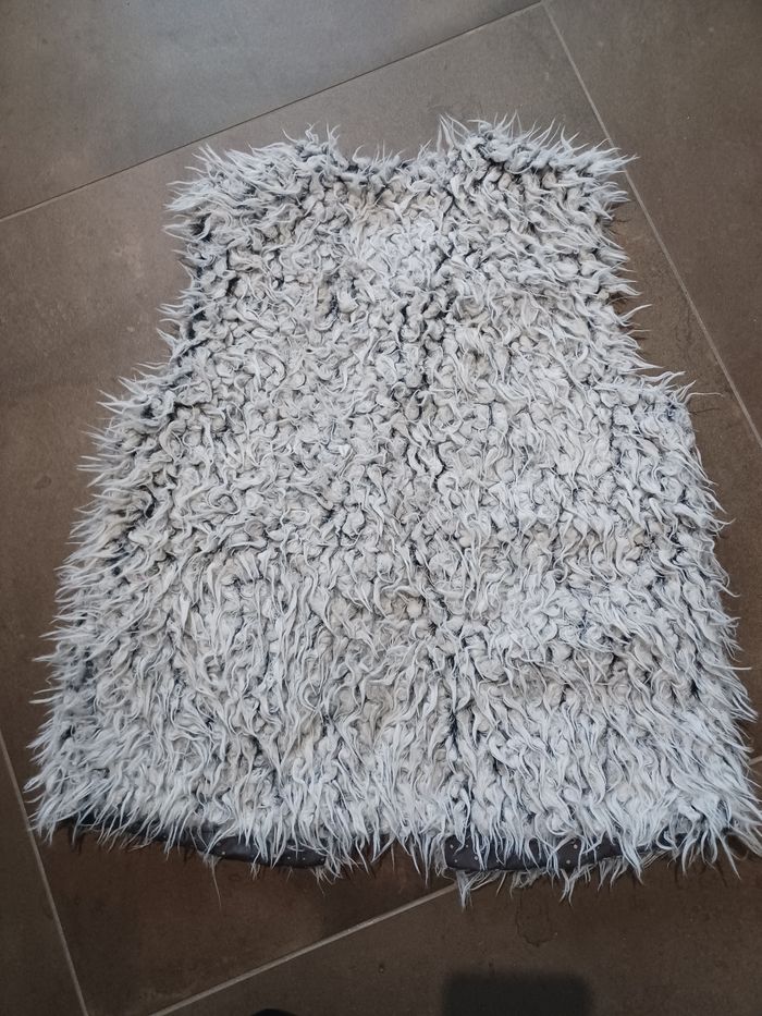Gilet a poils gris clair sans manche, avec bouton pour attacher en haut, doublé. Marque 3 pommes & girls, en 11-12 ans. Taille bien. En très bon état.