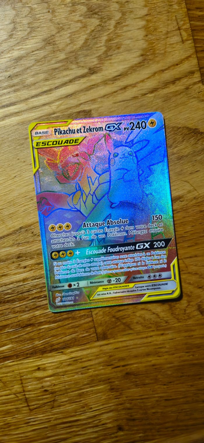 Carte Pokemon Pikachu et zekrom GX 184/181 Etat neuf, rangée directement à la sortie du booster. Nombreuses autres cartes Pokemon en stock. Je vend toute ma collection. Je vais mettre les annonces au fur et à mesure mais n’hesitez pas à demander si vous chercher une carte précise. Elles sont pour la plupart en état neuf. Prix négociables en cas de lots.