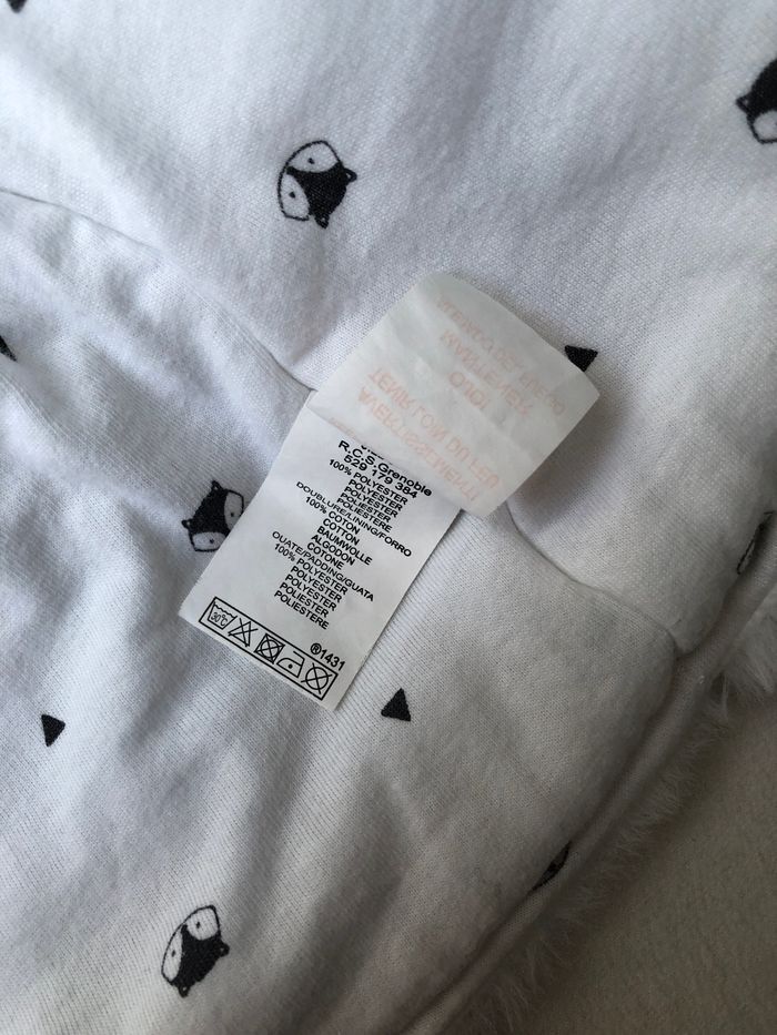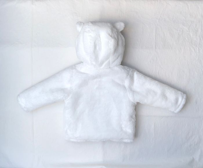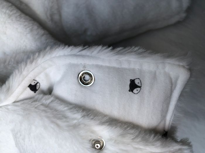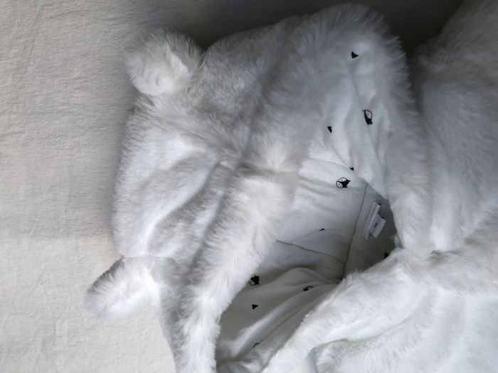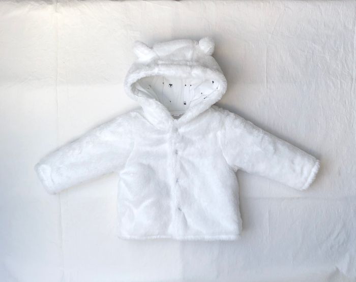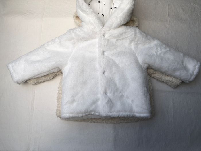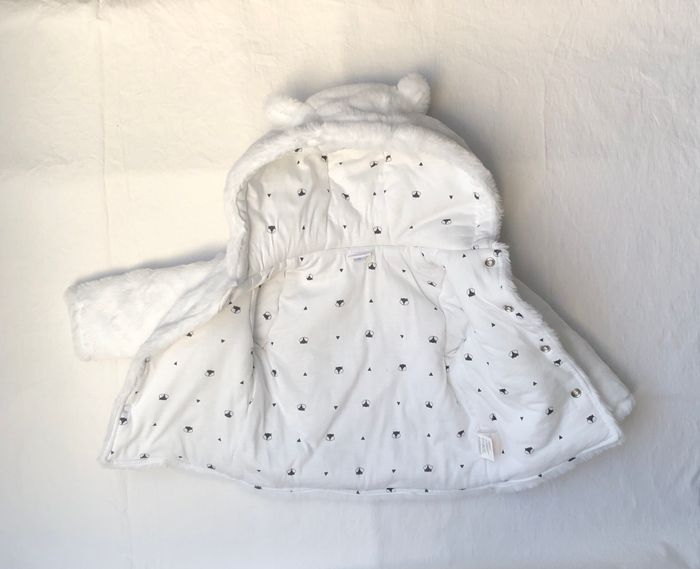Sublime manteau nounours P’tit bisou, Noté TU, correspond environ à du 6-9 mois, cf photo avec un manteau en 6 mois posé dessous. Le manteau tient bien chaud : il y a une épaisseur de ouate entre la fourrure et la doublure en coton. En fausse fourrure toute blanche, Doublure motifs petits renards, Petites oreilles sur la capuche. Magnifique pour parfaire une tenue de fêtes, Noël, cérémonie…ou pour la vie de tous les jours. Se ferme avec des pressions. En très bon état, non grisé, sans tache. La fausse fourrure est très douce et comme neuve. A noter que j’ai recousu un petit accro sur le tissu intérieur à côté d’une pression. Cf photo. 🌸 Vous aimez cet article ? N’oubliez pas de visiter le reste de mon dressing en filtrant les tailles.
