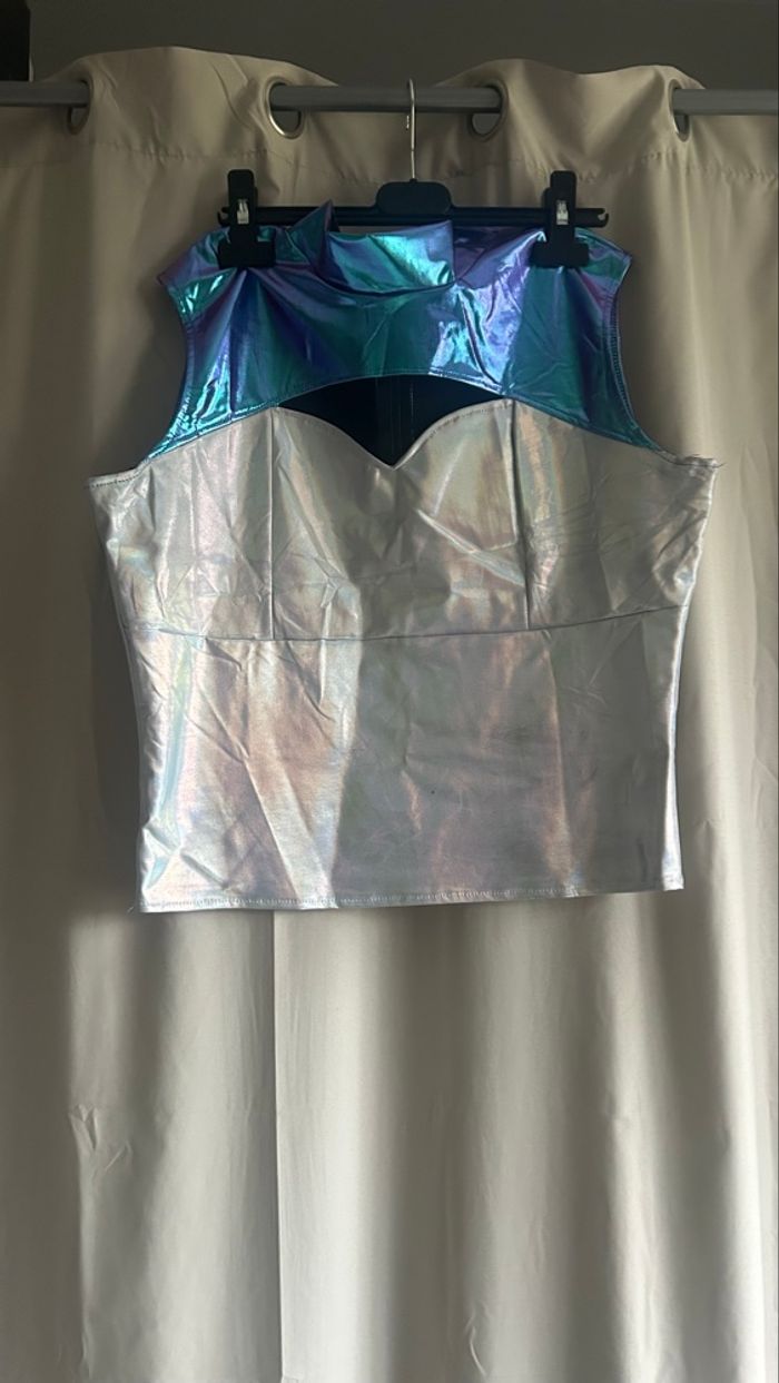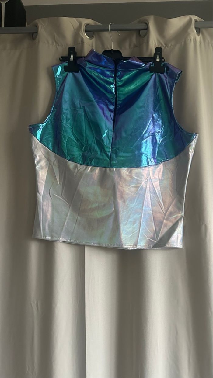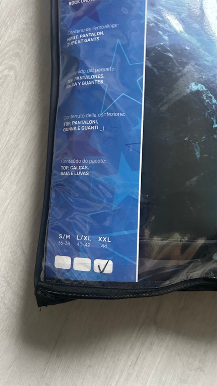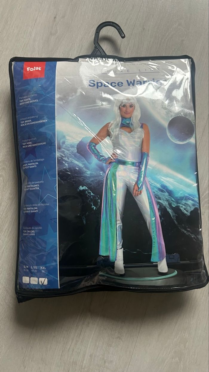 Déguisement femme Space Warrior. Jamais porté car trop petit. Il est complet (sans perruque). Il a quelques défaut au niveau du top sir la couleur argenté voir les dernière photo. Il est indiqué la taille 44 mais taille assez petit c’est plus une taille 40.