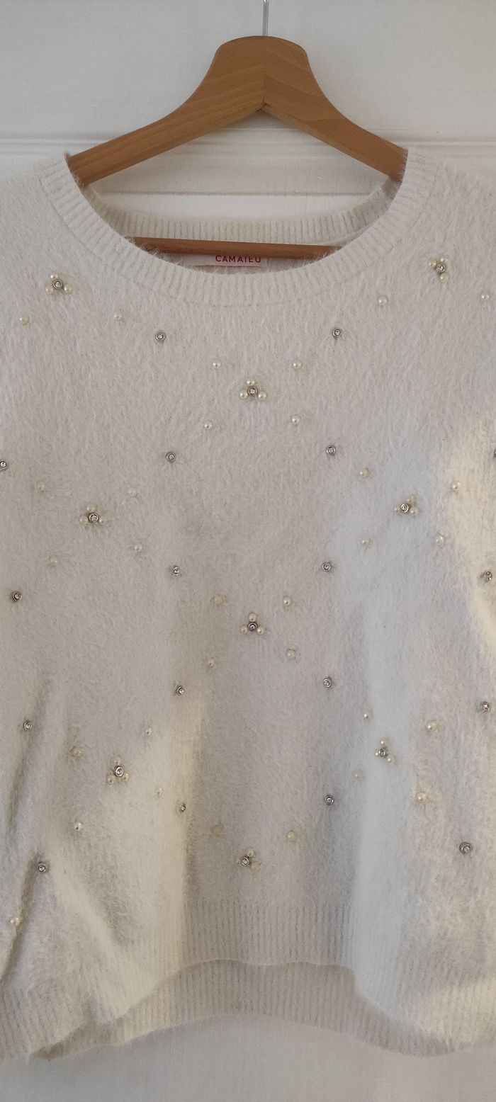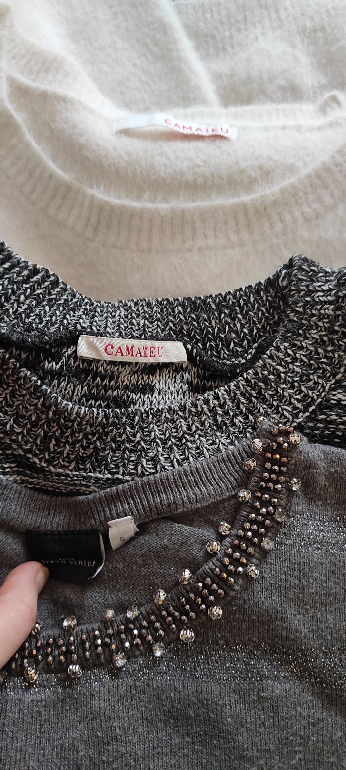 Lot de 3 pulls .1 pull Camaïeu chaud blanc avec brillants argentés .1 pull Camaïeu gris moucheté, croisé en bas .1 pull léger gris , rayé avec liserés brillants et strass brillants sur le haut Tous en très bon ou bon état Chacun taille S 36 Pensez aux lots : réductions activées