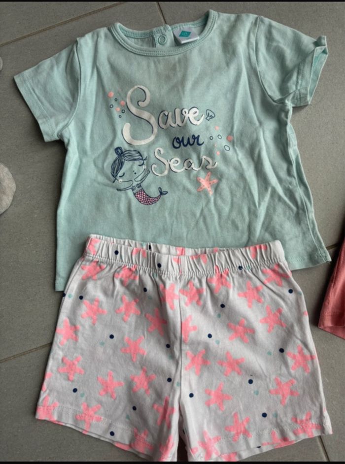 Lot été 12 mois, comprend un short (9-12 mois) et un pyjama (présente une petite tache sur la dernière photo)