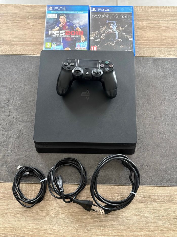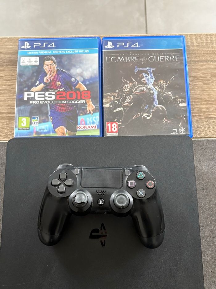 PS4 slim 500g en parfait état de fonctionnement avec câble alimentation, câble HDMI, chargeur manette et les 2 jeux sur la photo. Je reste disponible pour toute information ou photos supplémentaires.