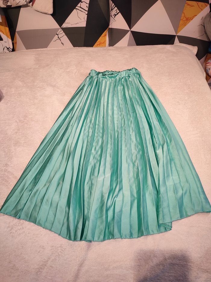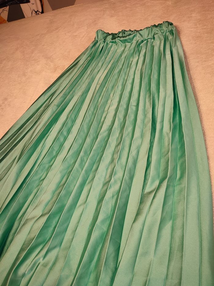 Jupe longue plissée vert satiné. Elle est neuve Taille 38, taille élastique