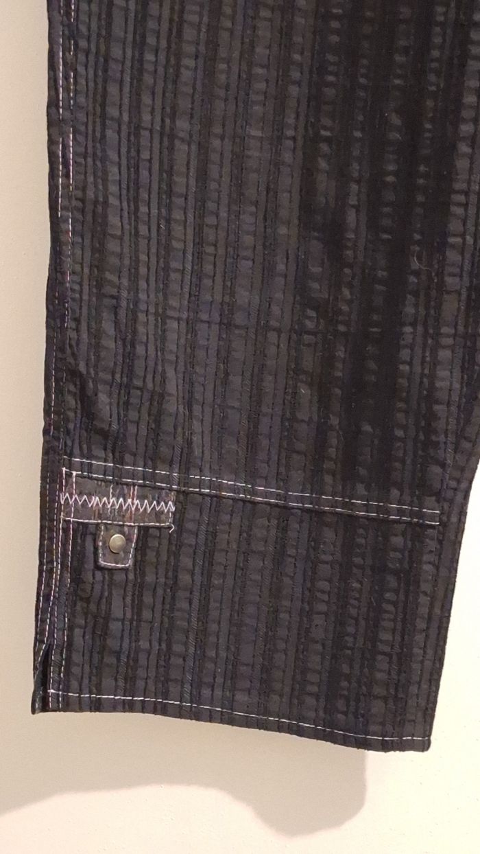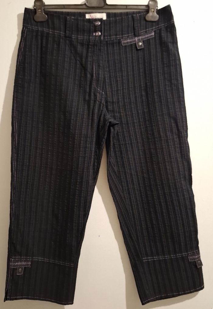 Pantacourt de 85 cm de hauteur en coton et polyamide. II se ferme par deux boutons et une fermeture éclair. Il a des passants pour mettre une ceinture. Des coutures couleur lilas sont apparentes. Il a des petites fentes aux chevilles. Le tissu fait comme des rayures en relief. Marque : Affinités, Armand Thiery.