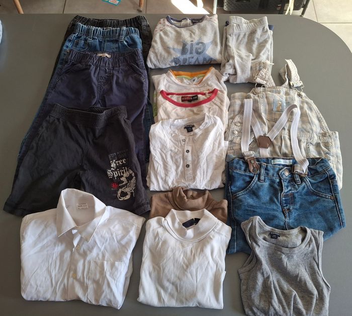 Lot vêtements garçon 2 ans - 3 pantalons - 1 short - 1 chemise - 1 pyjama 2 pièces - 2 Tee-shirt manches longues - 2 Tee-shirt manches courtes - 2 salopettes - 2 Tee-shirt col roulé
